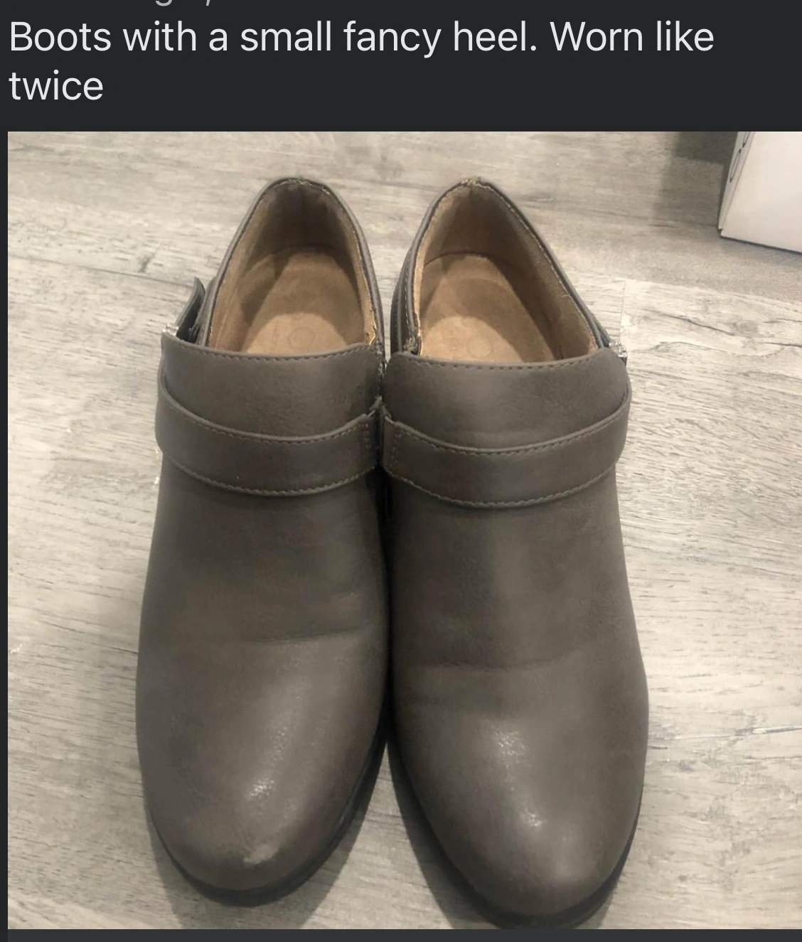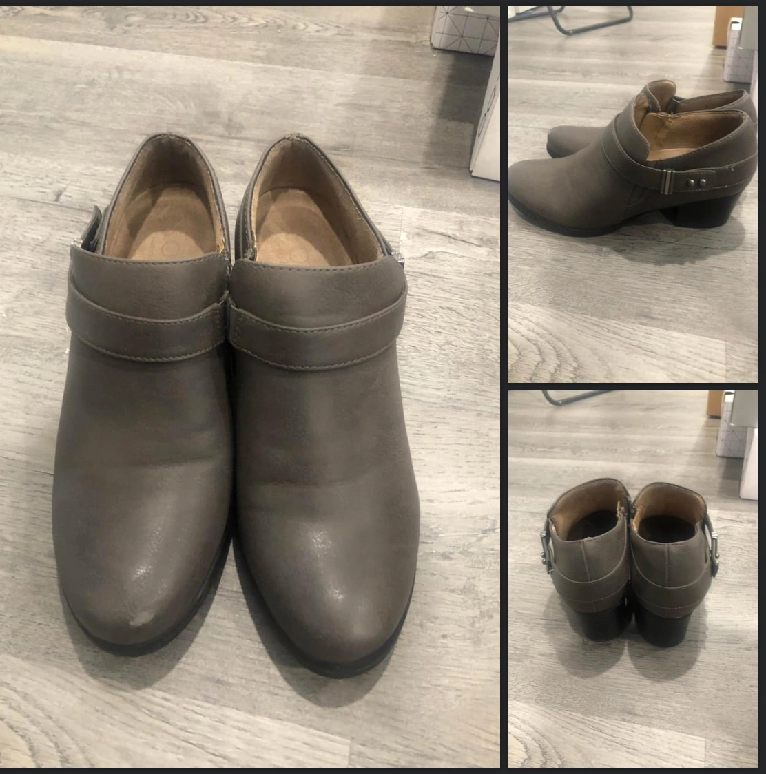 Grey ankle boots with a buckle detail. They have a small block heel. The boots are in good condition.