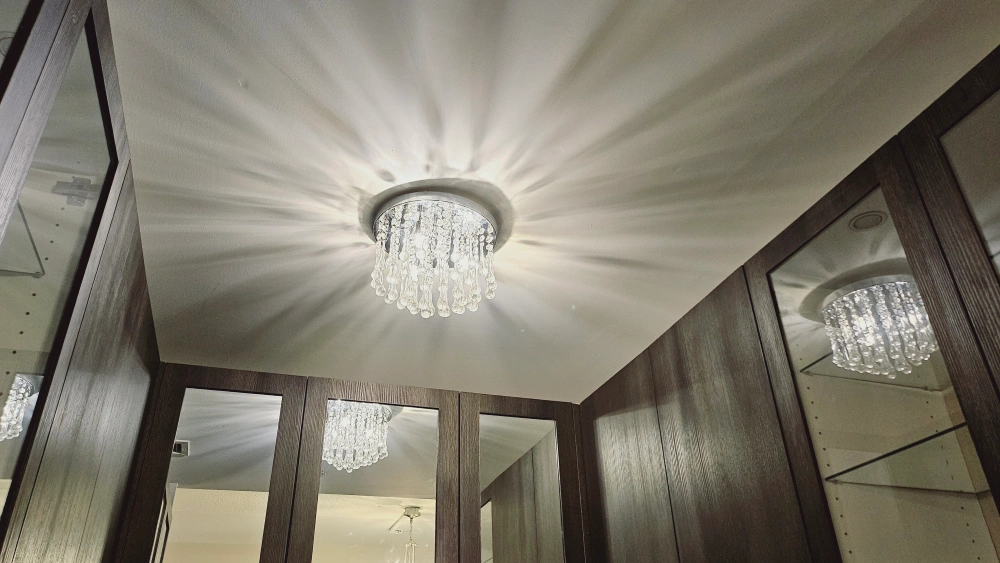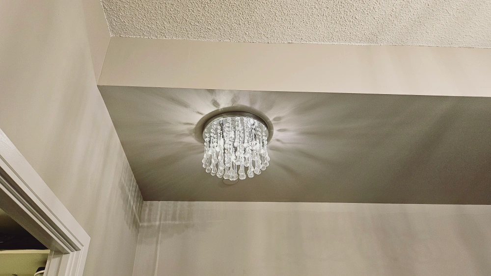 A small crystal chandelier light fixture. The fixture has a circular, silver base with crystals hanging from it. The fixture includes 3 bulbs. I have 2, one for $50 and 2 for $90. pickup only. low ballers will be ignored.
