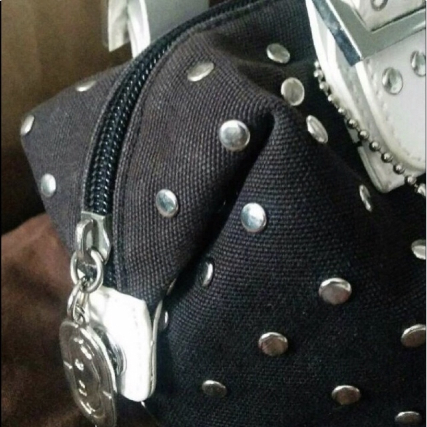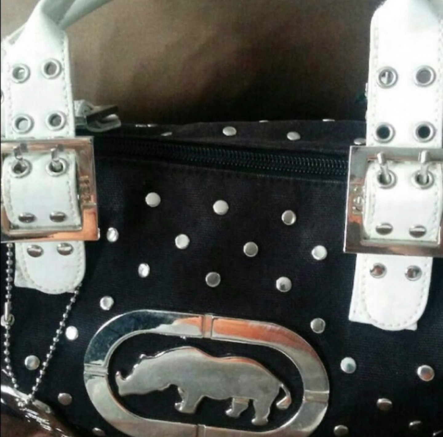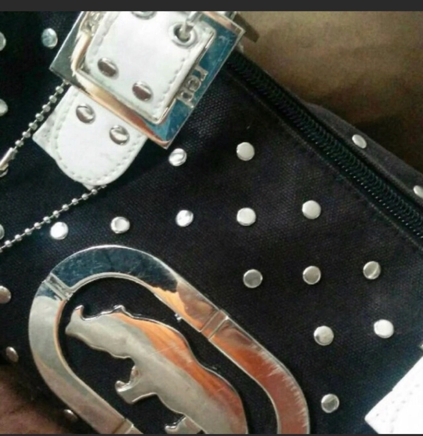 Small but good size Ecko brand purse $15 Preloved and in very good condition Black with a contrast of silver studs White leather handle 1 missing stud on the side not really noticeable as it’s loaded with studs Used a handful of times and in great condition Small and compact Pickup near wonderland Or shipping is available