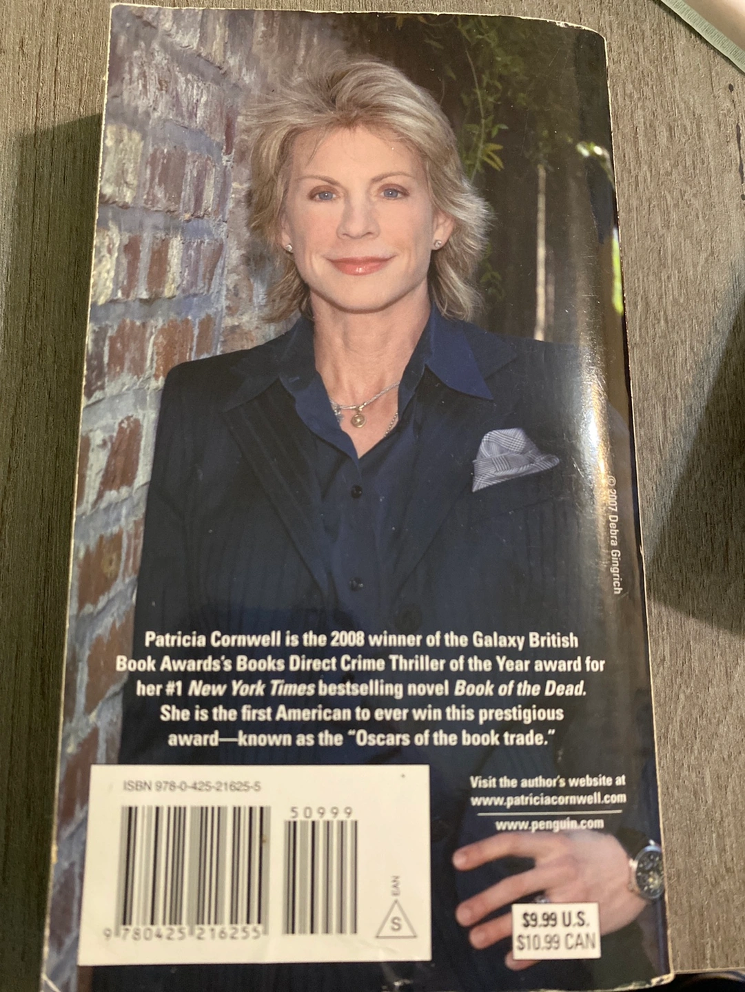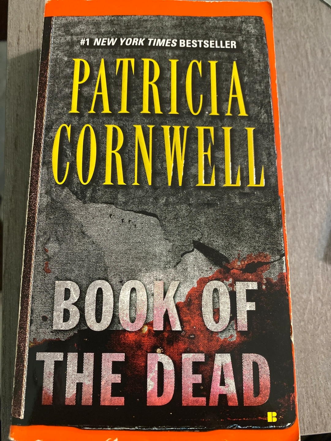 A hardcover copy of Book of the Dead, the 15th book in the Kay Scarpetta series, by Patricia Cornwell. The book is a #1 New York Times bestseller.