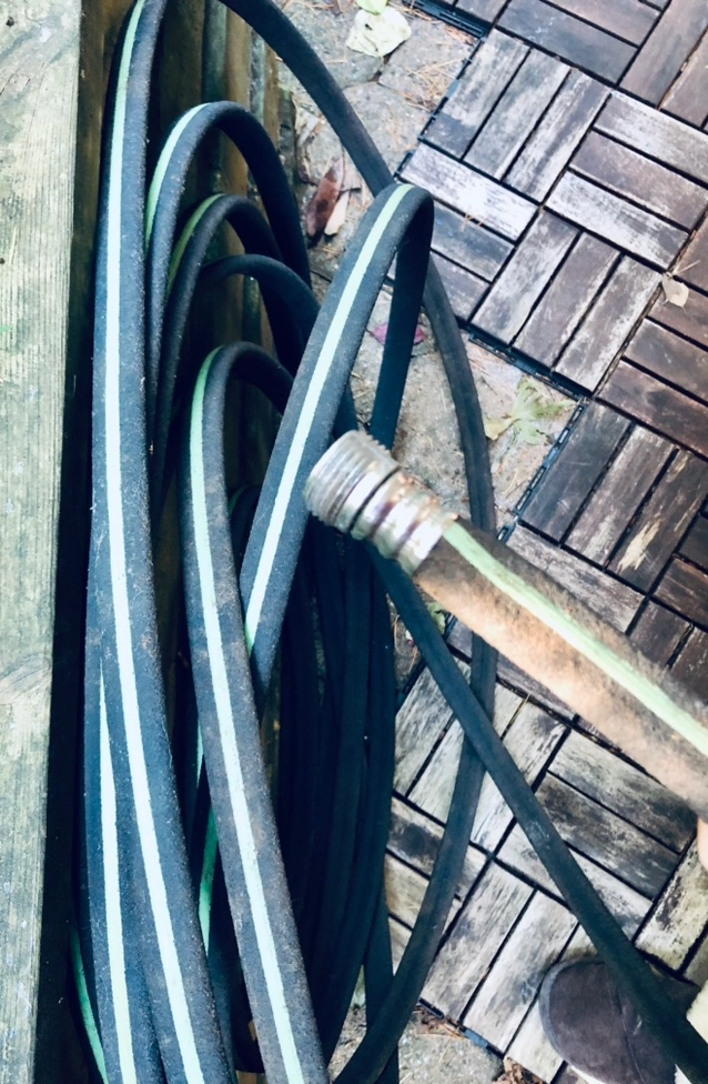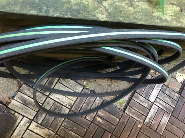 A long garden soaker hose in good condition with a standard connector. It is black with green stripes. Only used a few months.