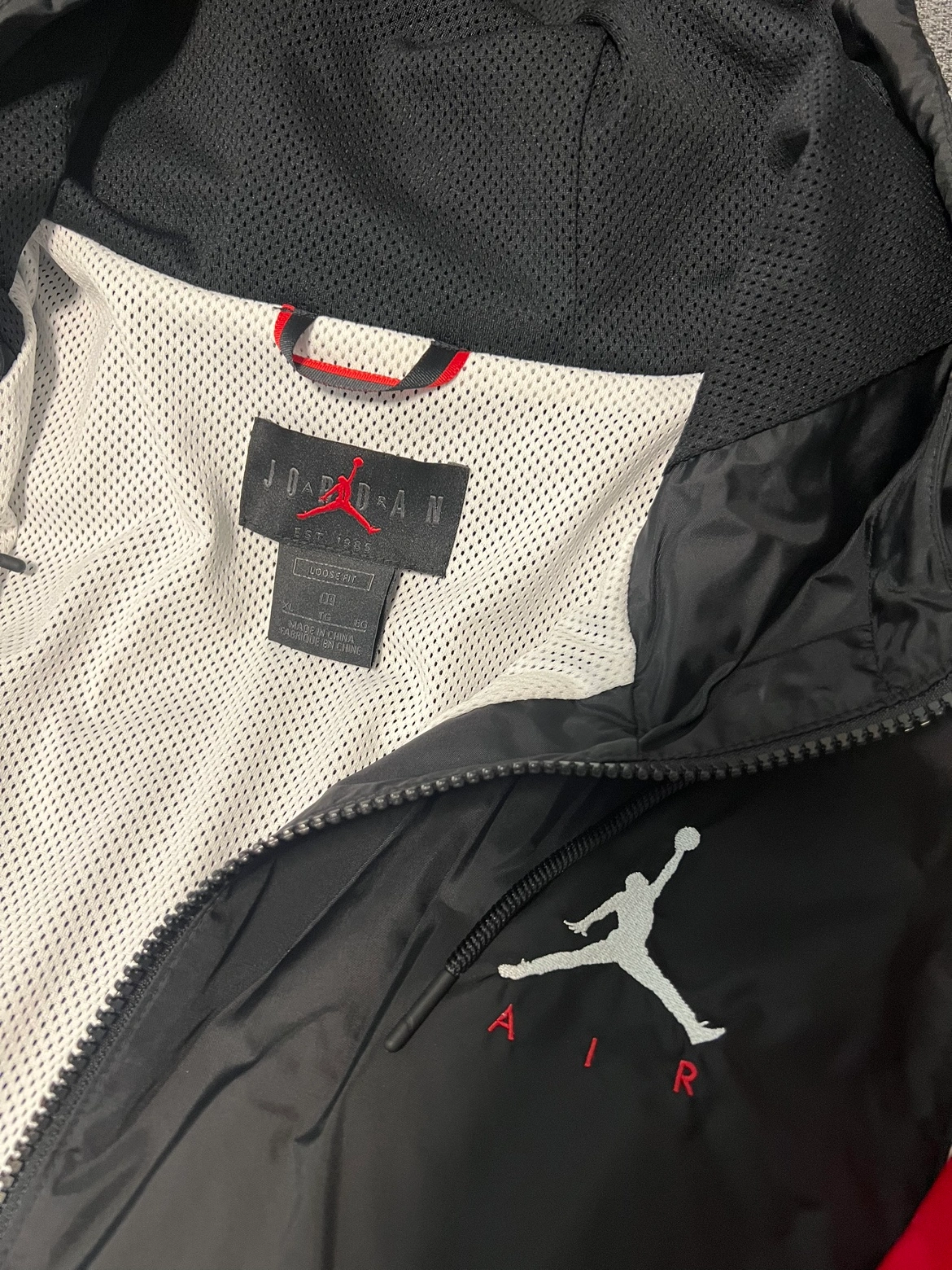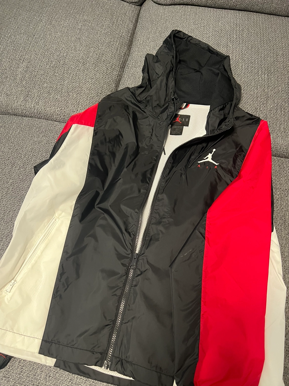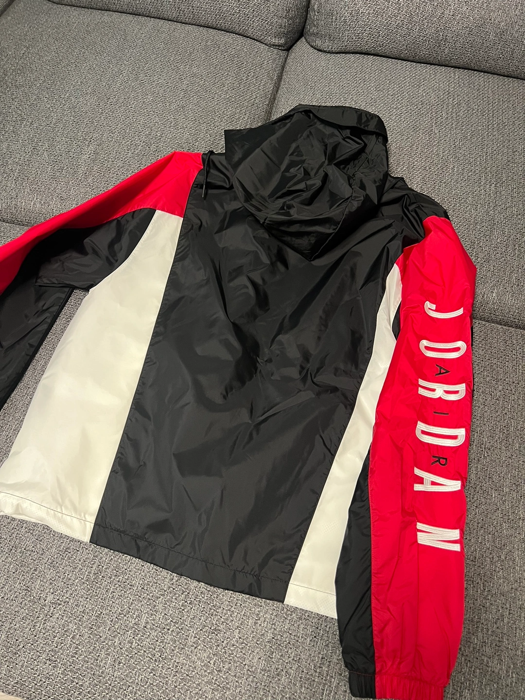 Black, white, and red windbreaker jacket with a zipper closure, two pockets, and a hood.