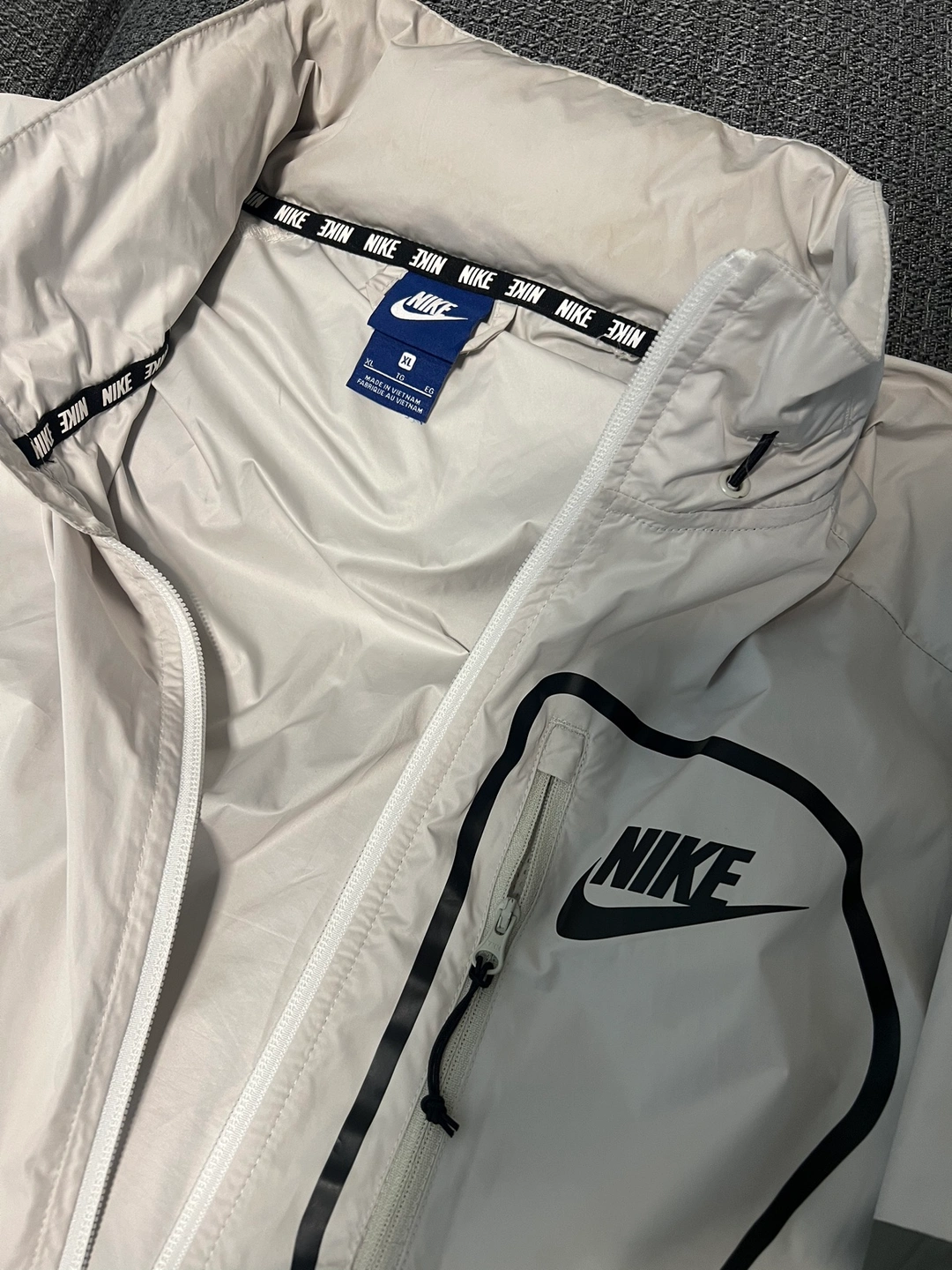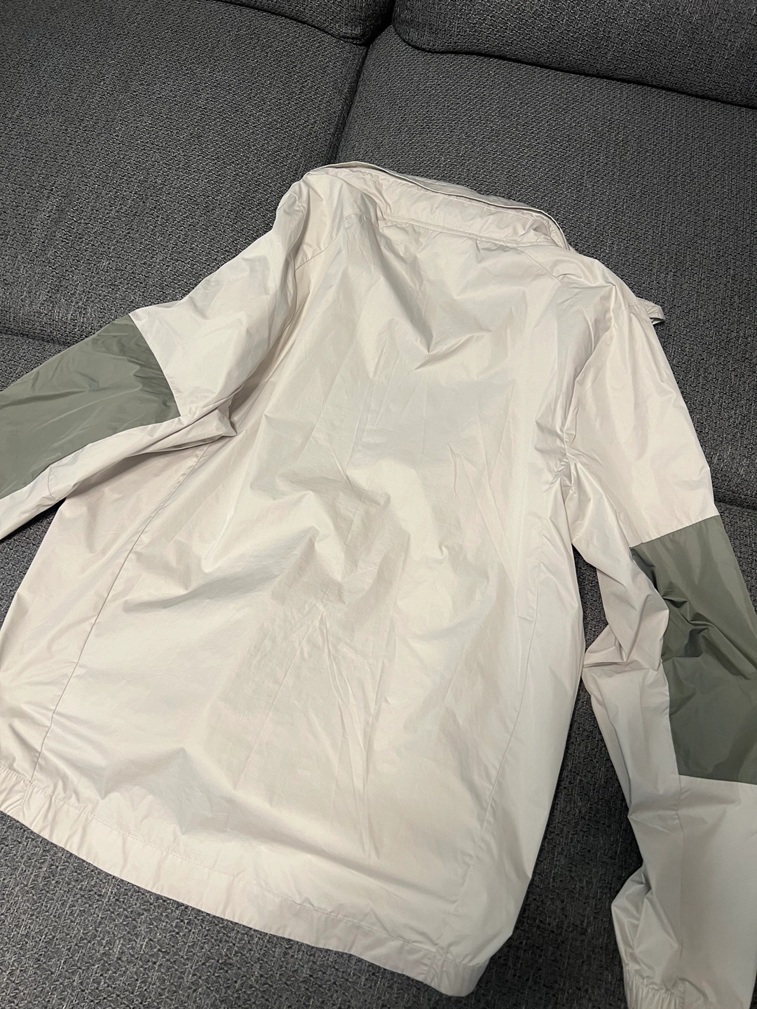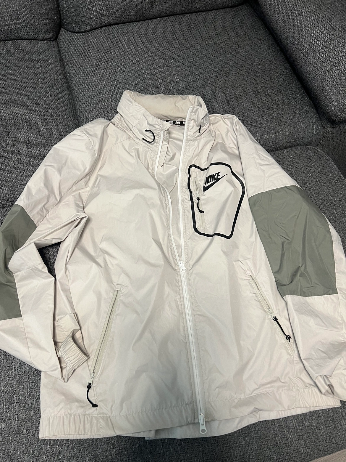 Men's size XL jacket with a grey and white colour scheme. It features a zipper closure, pockets, and a hood.