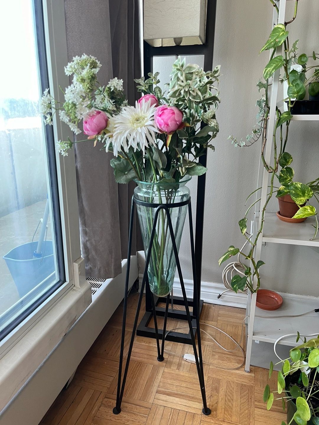 This is a vintage piece, my grandparents used to own it in the 90s. Great condition and durable. The flowers weren’t included but added for decor and are included in the price. Horizontally it’s about 18cm and one stand measures 68cm. Glass can be separated from the stand. It is a little heavy but can be carried by one person