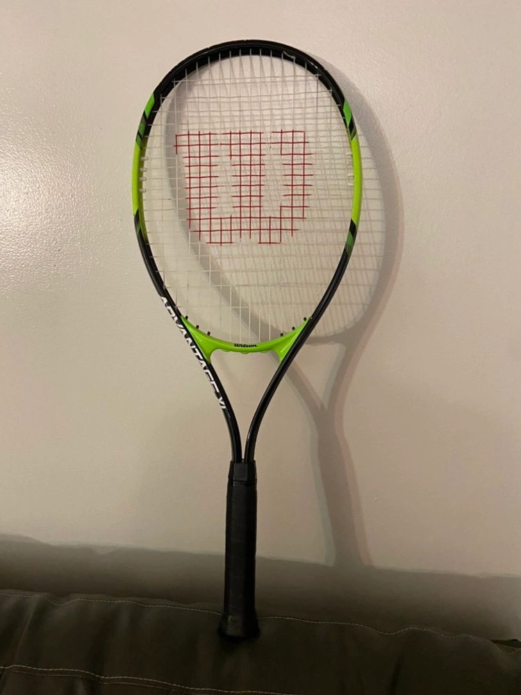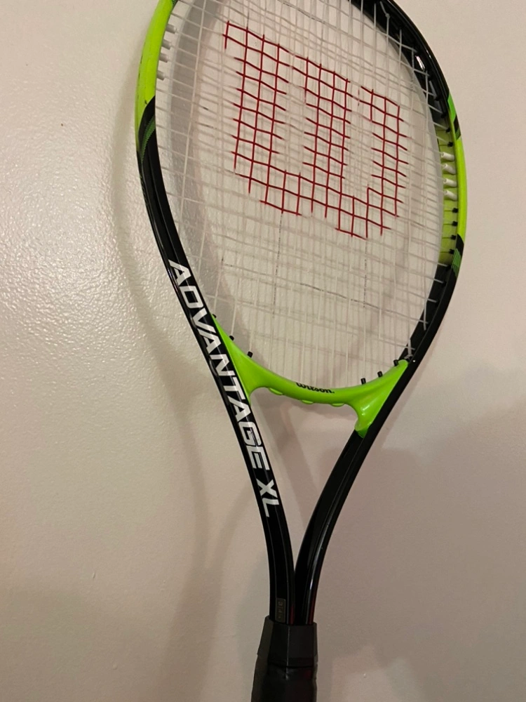 A Wilson Advantage XL tennis racquet. It is green and black in colour. The racquet has a grip size of 4 1/4. It is strung with a synthetic gut. The racquet is used. Only available for pick up.