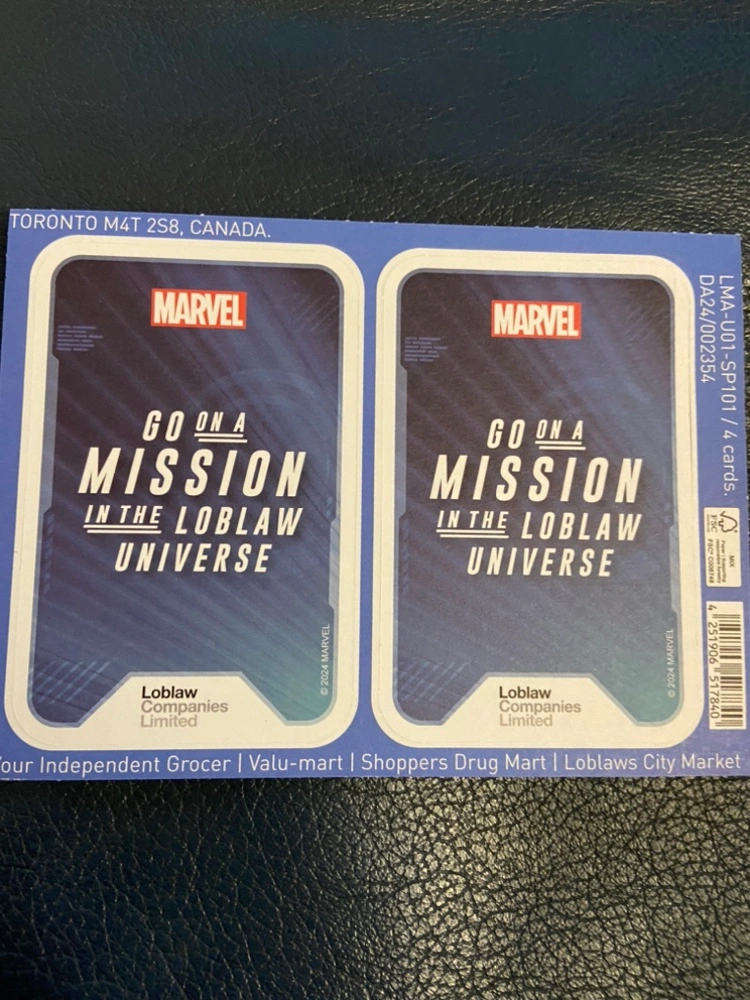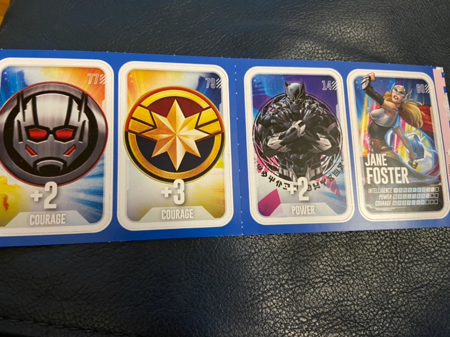 Set of 4 trading cards with various Marvel characters, including Ant-Man, Captain Marvel, Black Panther, and Jane Foster. Only available for pick up.