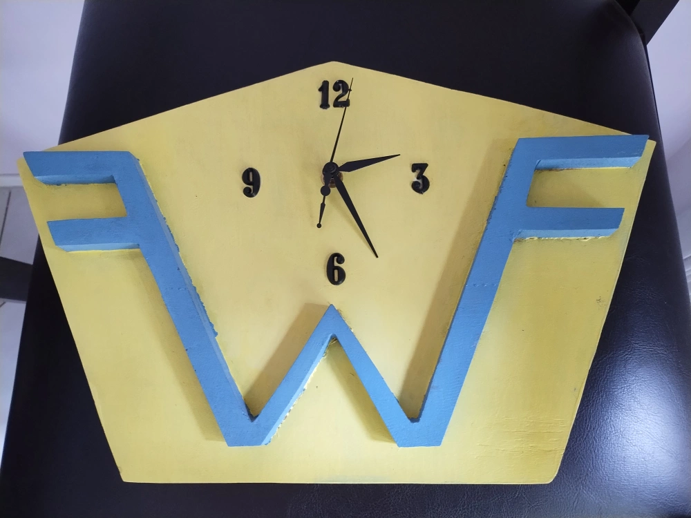 This is a wall clock shaped like a "W" with blue accents. It has a clock mechanism on the back.