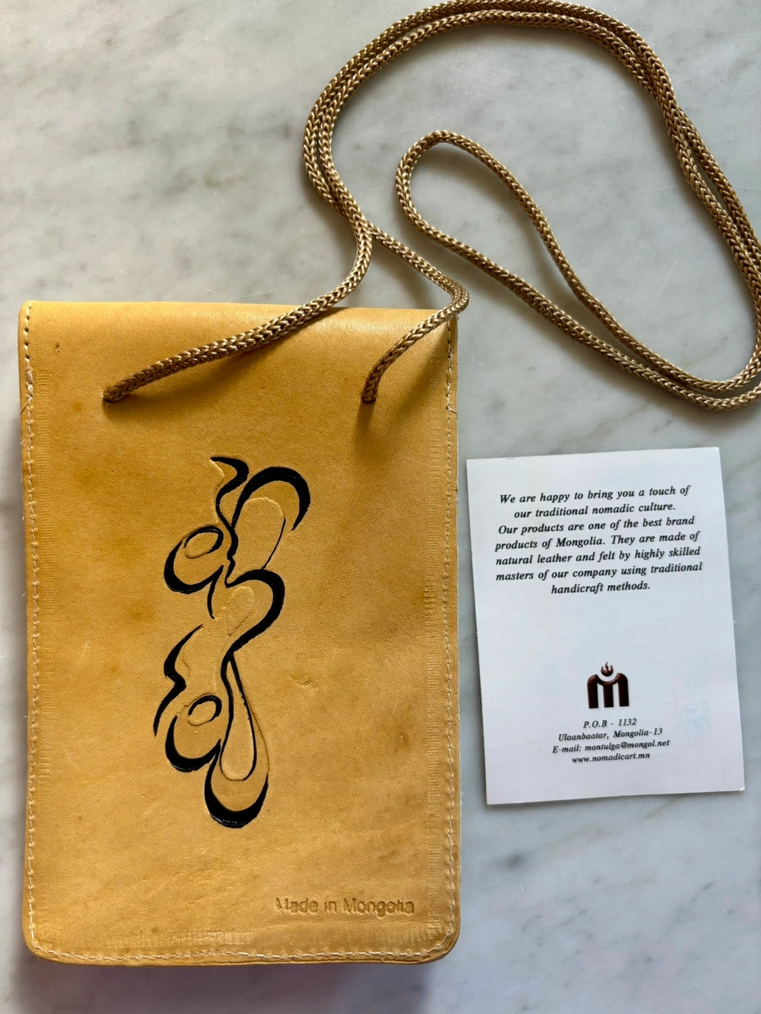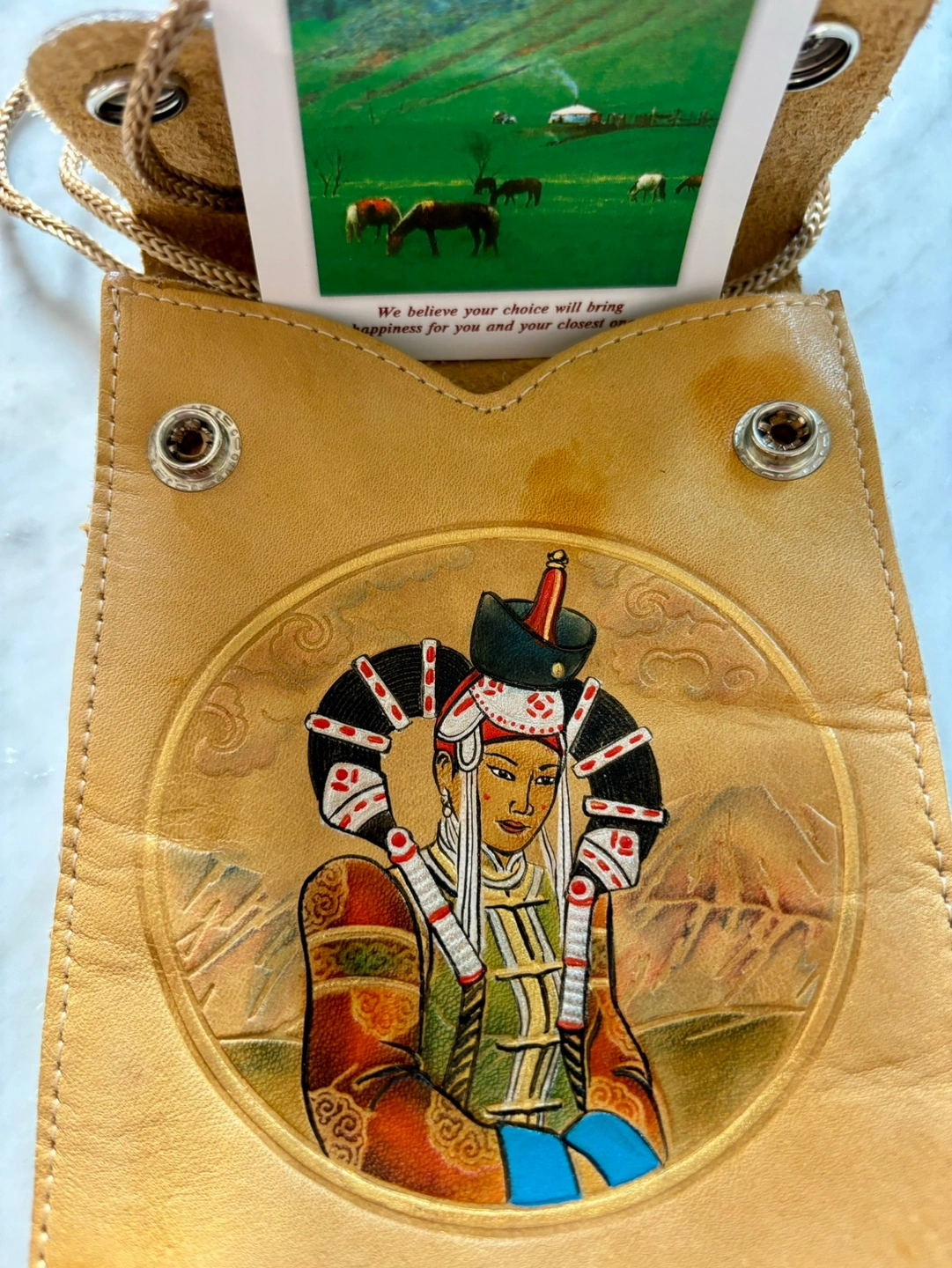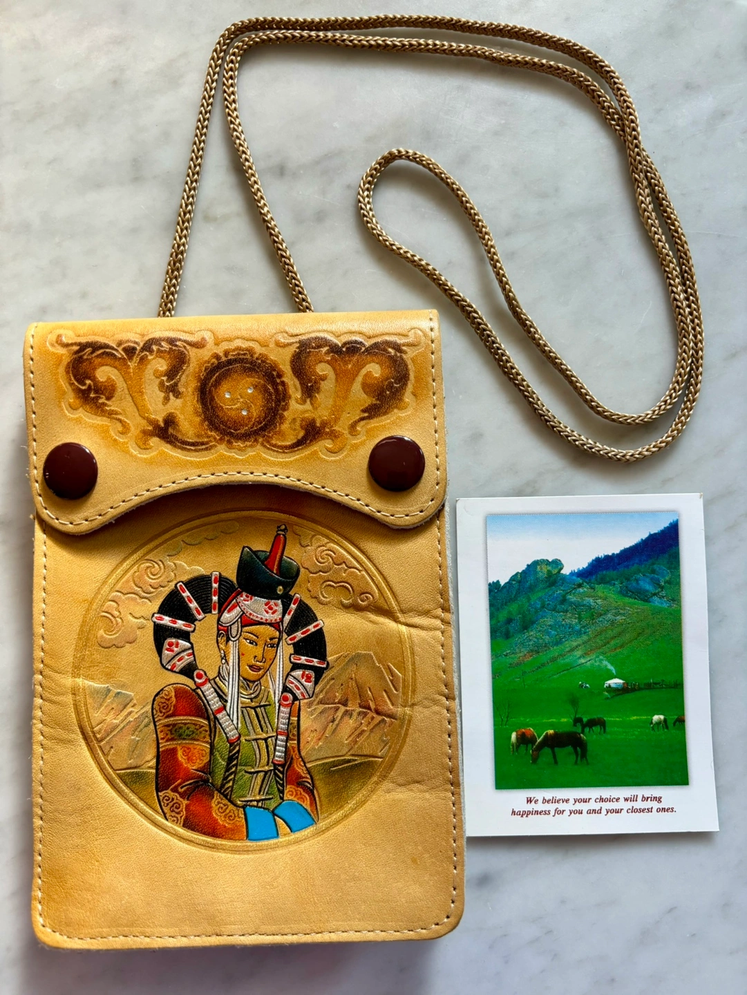 Leather purse with traditional Mongolian design. Made in Mongolia. Features a long shoulder strap, and a snap closure. The purse is decorated with a woman wearing traditional clothing, and the background is a mountain scene. A smart phone fits inside. Click on my name for my other listings and pickup locations.