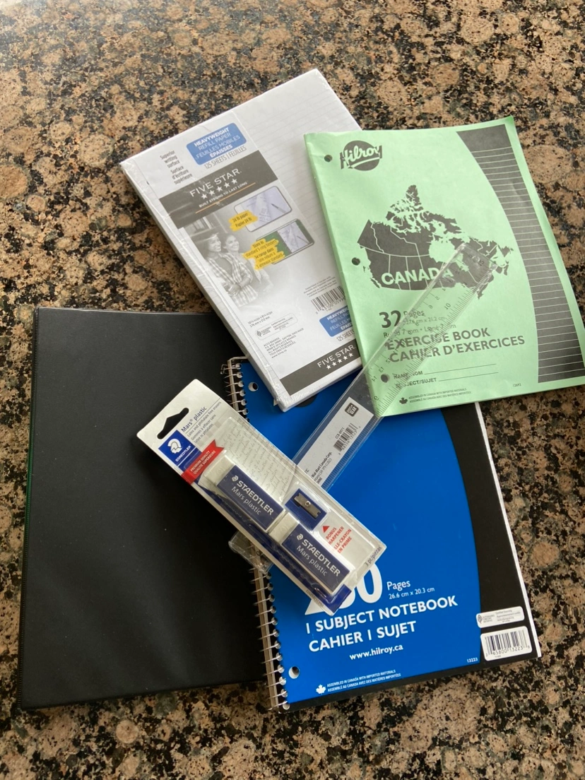 A blue Hilroy exercise book with 32 pages, a ruler, and two erasers plus a few others