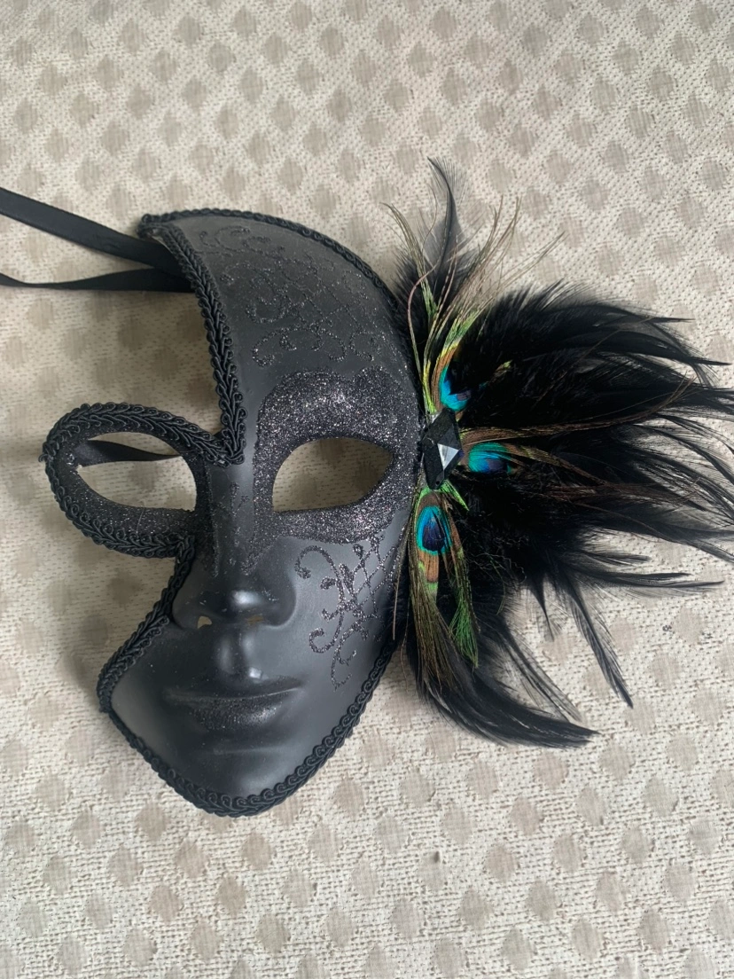A black masquerade mask with feathers and rhinestones. The mask is half-face and has an intricate design. It comes with an attached black ribbon for wearing. Beautiful, classy mask I purchased in New Orleans several years ago for $35 USD + tax. Great for Halloween coming up.