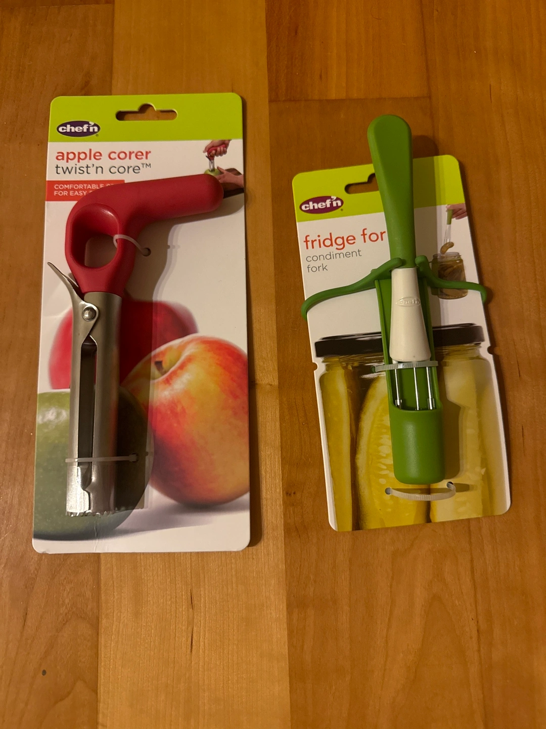 Two new, unopened kitchen gadgets. Both are from the Chef'n brand. One is a red apple corer and the other is a green condiment fork. Both come in their original packaging. Both for $10.