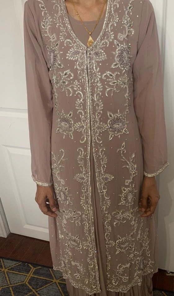 Beautiful, fully embroidered salwar kameez with long sleeves. The material is a soft, flowy chiffon.