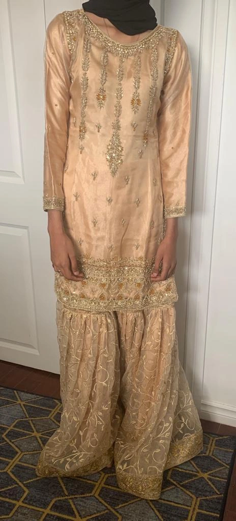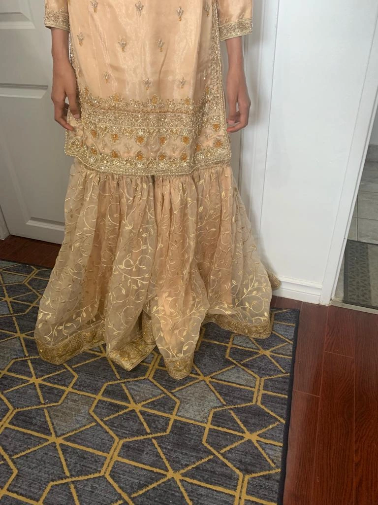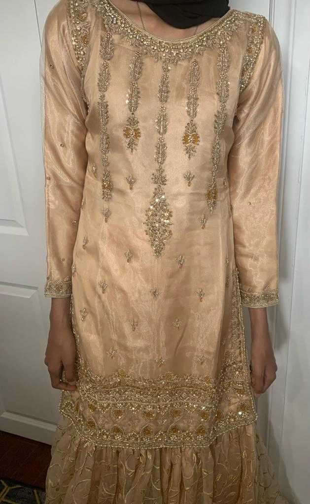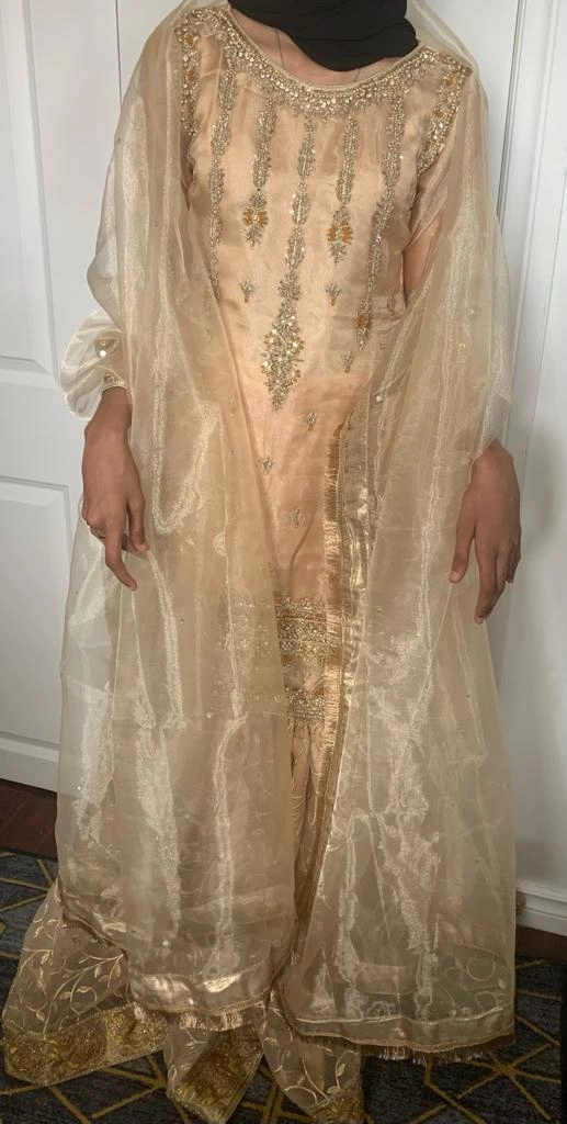Beautiful gold Pakistani Shalwar Kameez with intricate embroidery and embellishments. It includes a long-sleeved kameez, a matching shalwar and a dupatta.