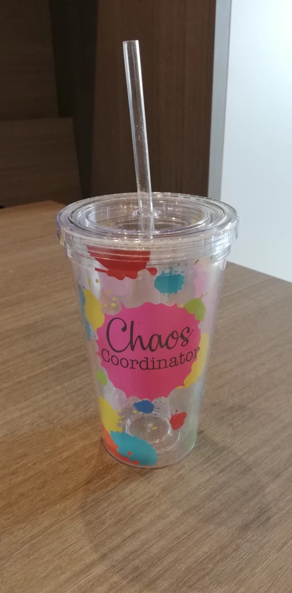 A clear tumbler with a pink, black and white "Chaos Coordinator" graphic, colourful splatter paint design, and a reusable straw. Brand New! Great for carrying your cold drinks on the go! Pick-up location: Union Station Check out my other items! If you have any questions, please let me know! Once sold, there will be no refunds.