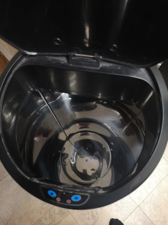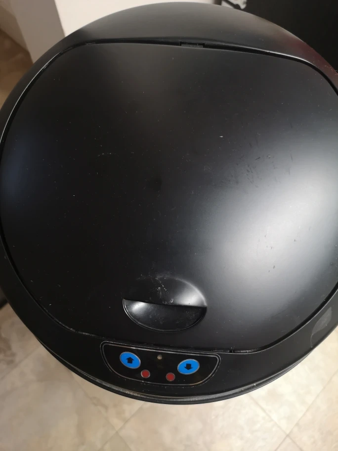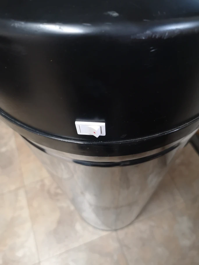 A touchless trash can with a stainless steel body. On/Off switch at back Motion sensor opens and automatically closes 4 D new batteries included porch pick up - no delivery