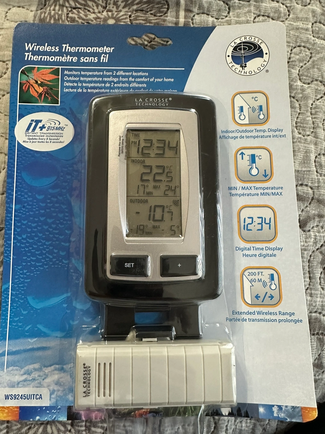 Wireless thermometer with indoor and outdoor temperature readings, minimum/maximum temperature records, and extended range.