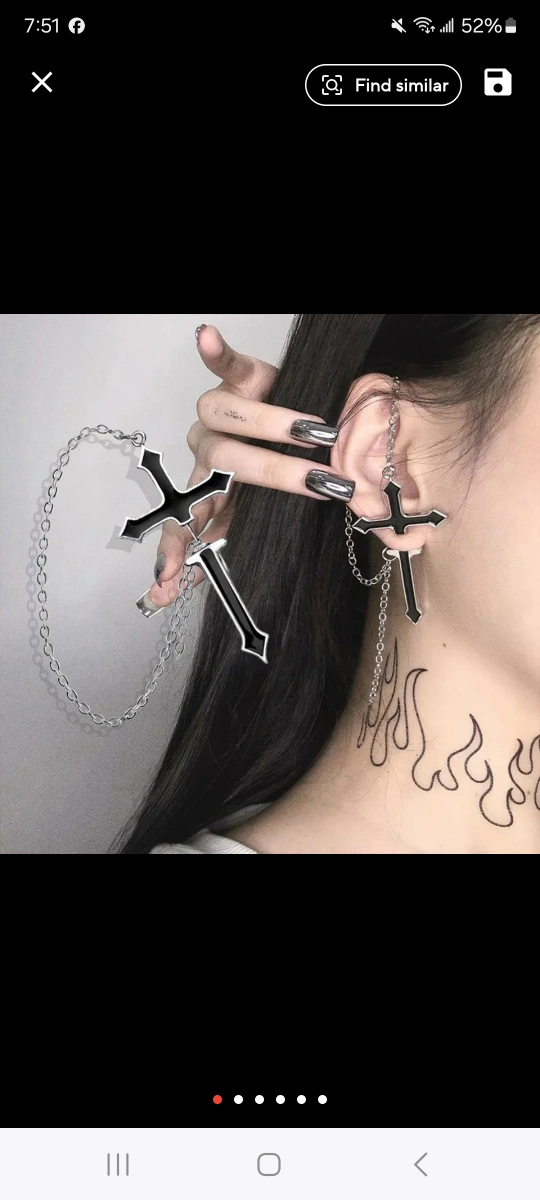 A pair of black and silver cross earrings with a chain connecting them.
