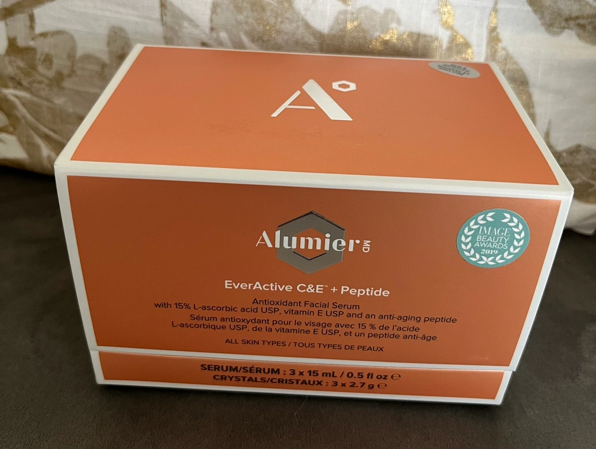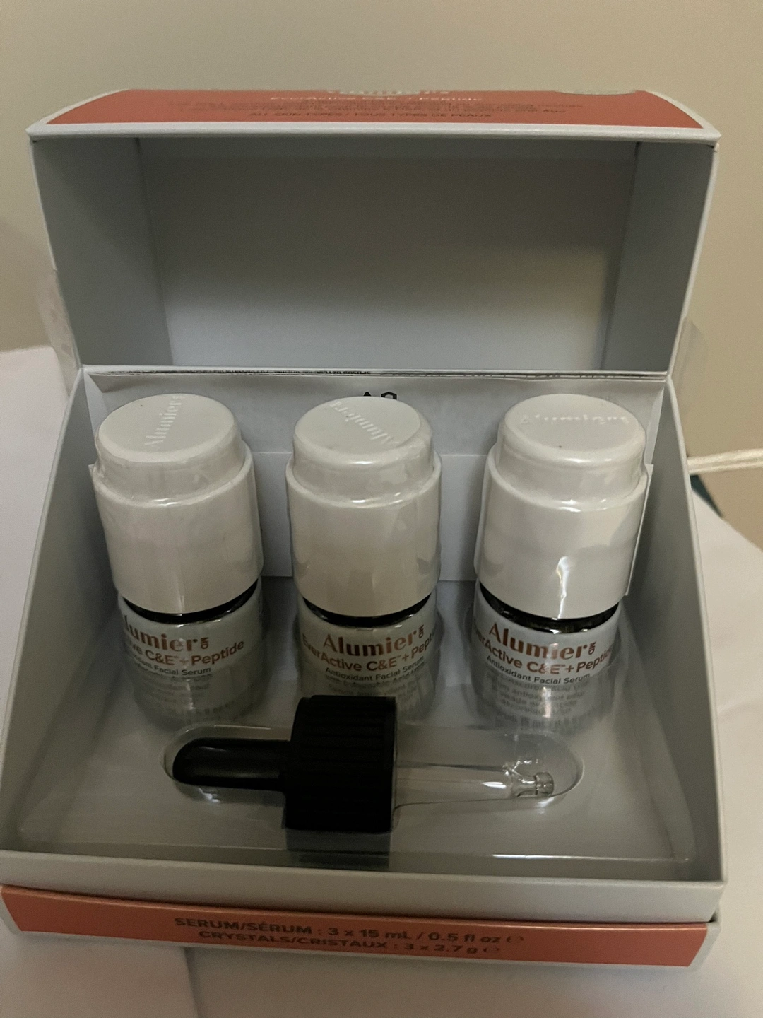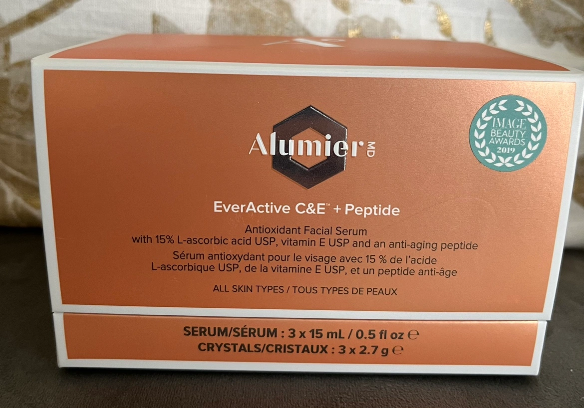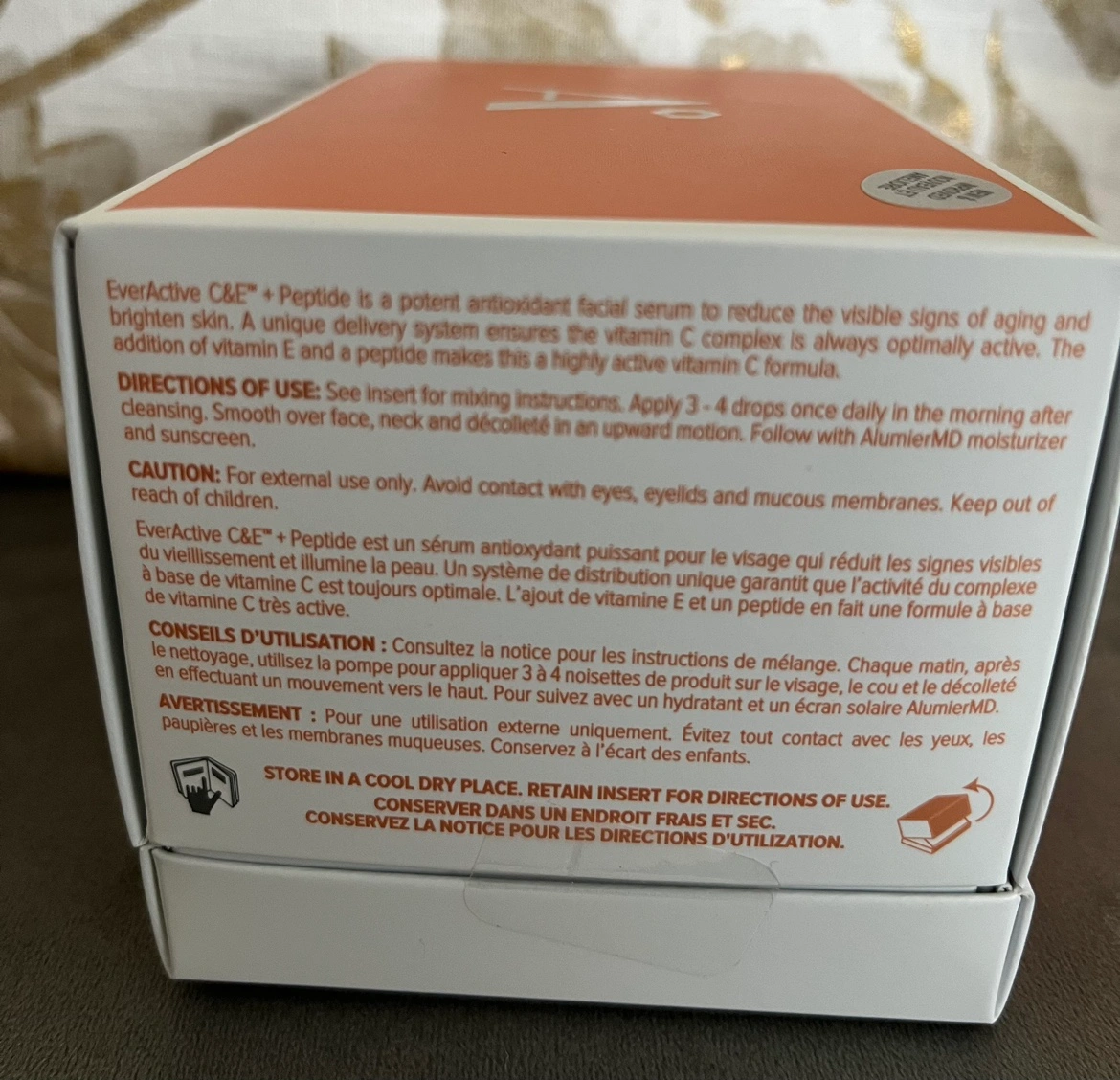 Alumier EverActive C&E + Peptide antioxidant facial serum 3x 15ml bottles Note: there is no expiration date on the serum. It is activated once opened. It comes with labels to document when activated. I have more than one box available. Buy more save more. A potent, clinically validated, antioxidant serum to reduce the visible signs of aging. A unique delivery system ensures the 15% vitamin C complex is always optimally active. The vitamin C crystals are kept separate in a unique cap and only mixed into the bottle of serum when you are ready to use it. An award-winning, high-strength vitamin C and vitamin E serum that reduces the appearance of fine lines and wrinkles, revitalizing skin. The antioxidants, vitamin C and vitamin E, neutralize free radicals while vitamin C and MATRIXYL® Synthe'6® strengthen and brighten skin. Many vitamin C serums oxidize in their bottles, turning a brownish color while they are on the shelf or at home. When oxidized, the vitamin C is no longer beneficial to the skin. EverActive C&E® + Peptide stays fresh because you only mix the 15% vitamin C into the serum when you’re ready to use it. 3 x 15mL / 0.5 fl oz https://www.alumiermd.ca/products/everactive-c-e
