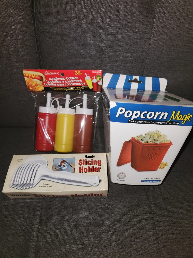 This is a popcorn maker that makes popcorn in under two minutes. It comes with a lid and a base that have the words "Pop Corn" on them. It also comes with 3 condiment bottles and a handy slicing holder. $12 total for all 3! Cash only. Pickup only.