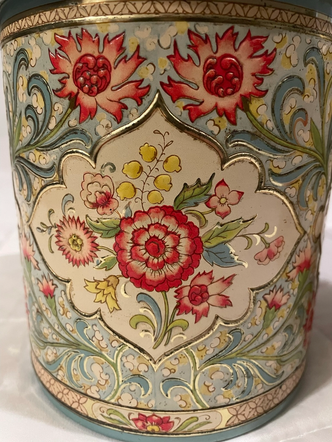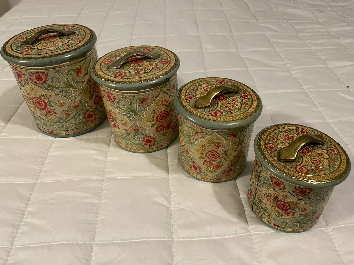 Vintage floral tin canisters with a blue and cream base with a gold trim. They all have lids with gold handles. They would be perfect for storing tea, sugar, or other small items. Same set seen in cottage decor magazines!! Another set currently on eBay $106 for only 3 canisters.