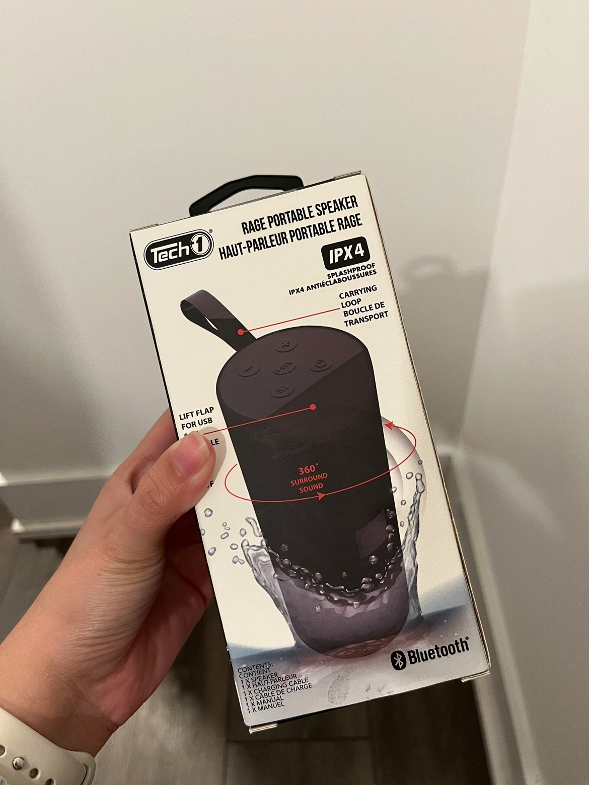 This is a Tech 1 Rage portable Bluetooth speaker. It has a carrying loop, a lift flap for a USB port and 360 degree surround sound. It is also splashproof. - brand new - still packaged - never used - connects to various devices - perfect for a house party or when you have friends over - great quality for the price