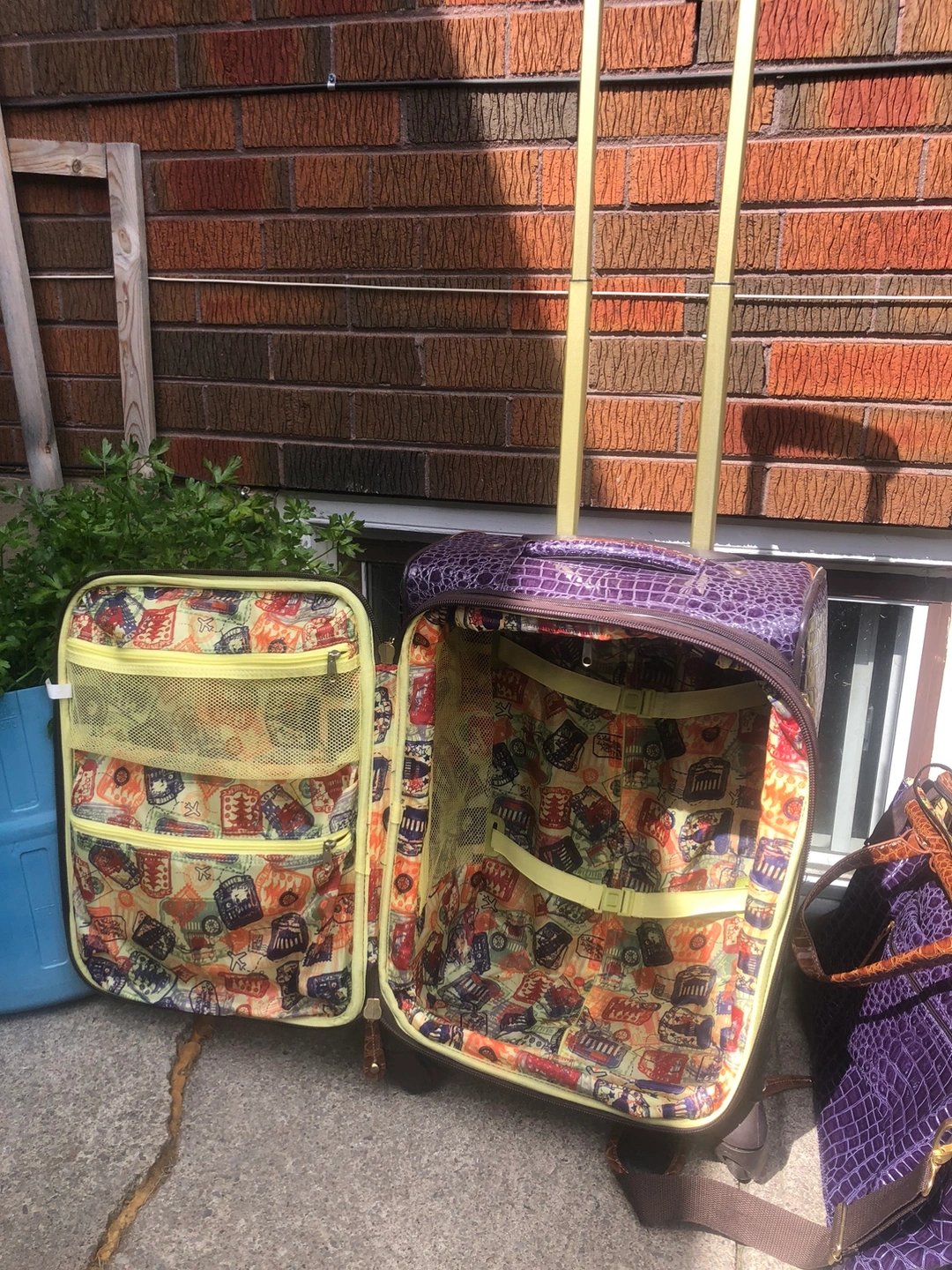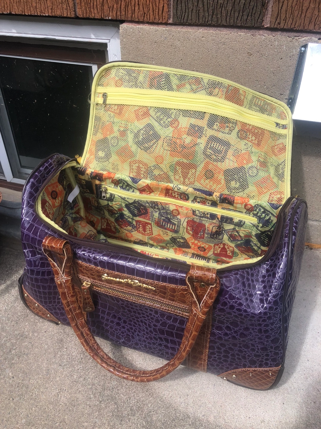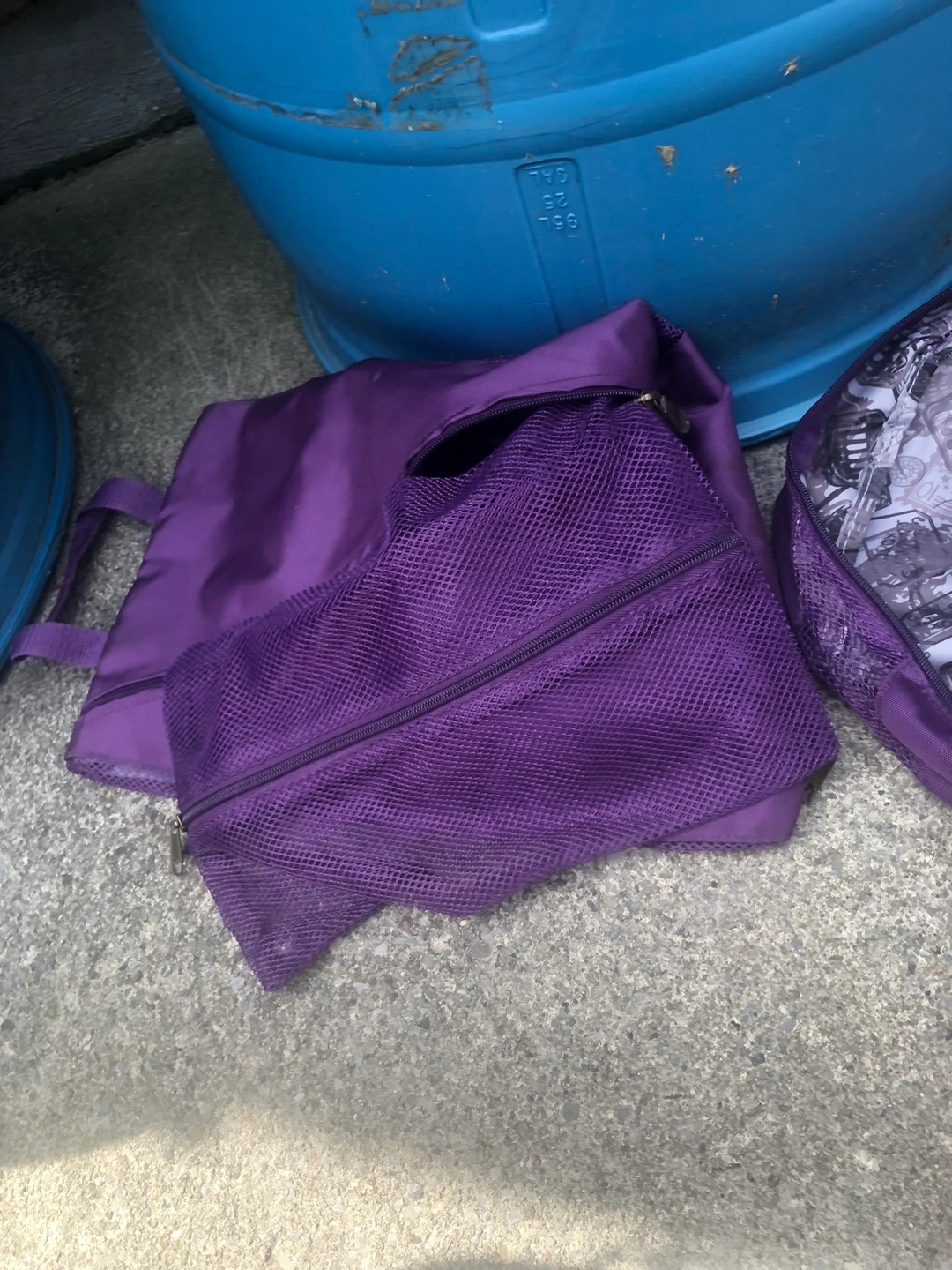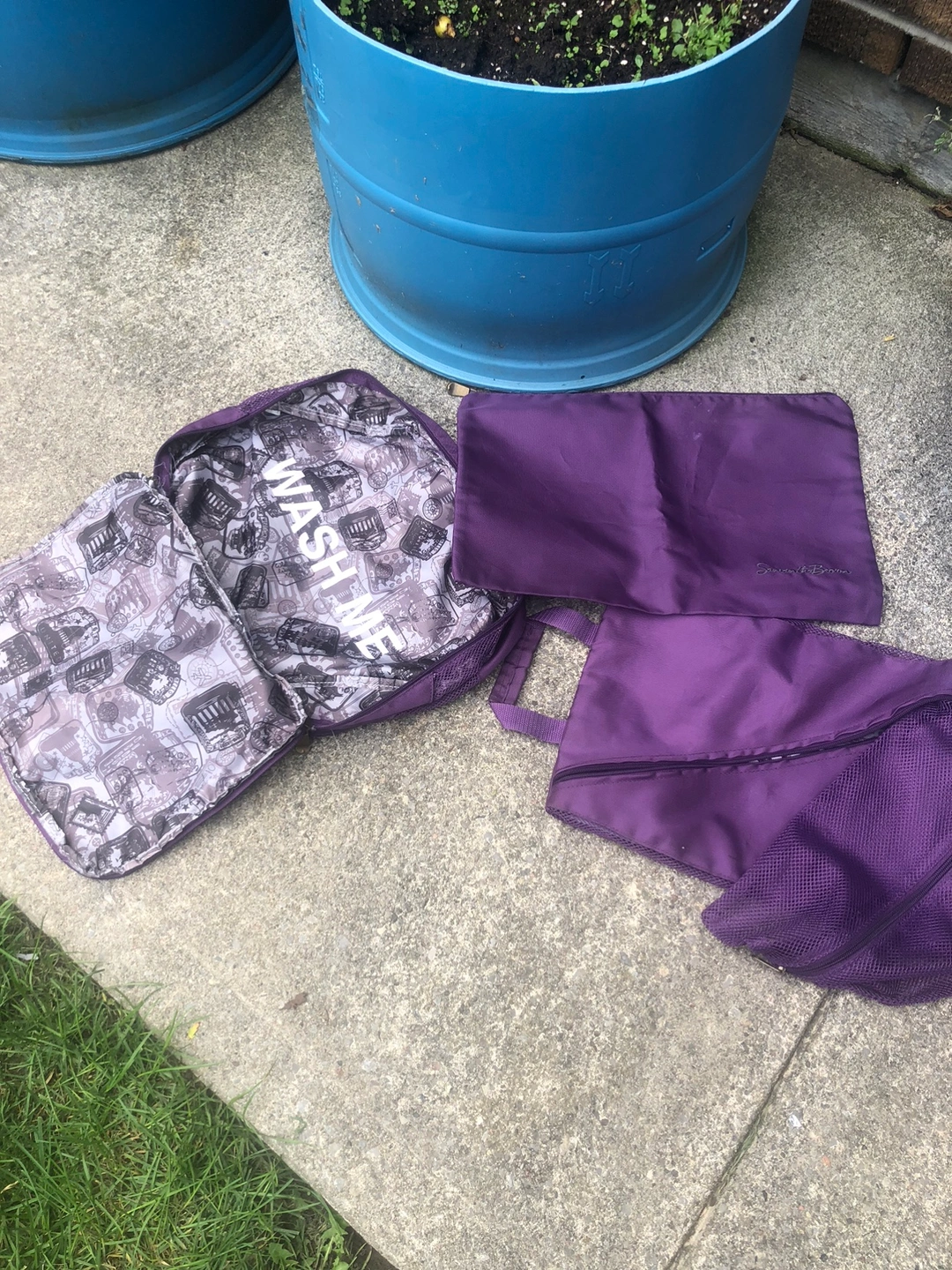 6 Piece Purple luggage set Consist of a Duffle Bag , a smaller carry-on Bag and suitcase on wheels with a Pull out Handle : Also comes with 3 Packing Squares and a Mesh attachment bag 🙏Great Condition NO LOWBALL OFFERS