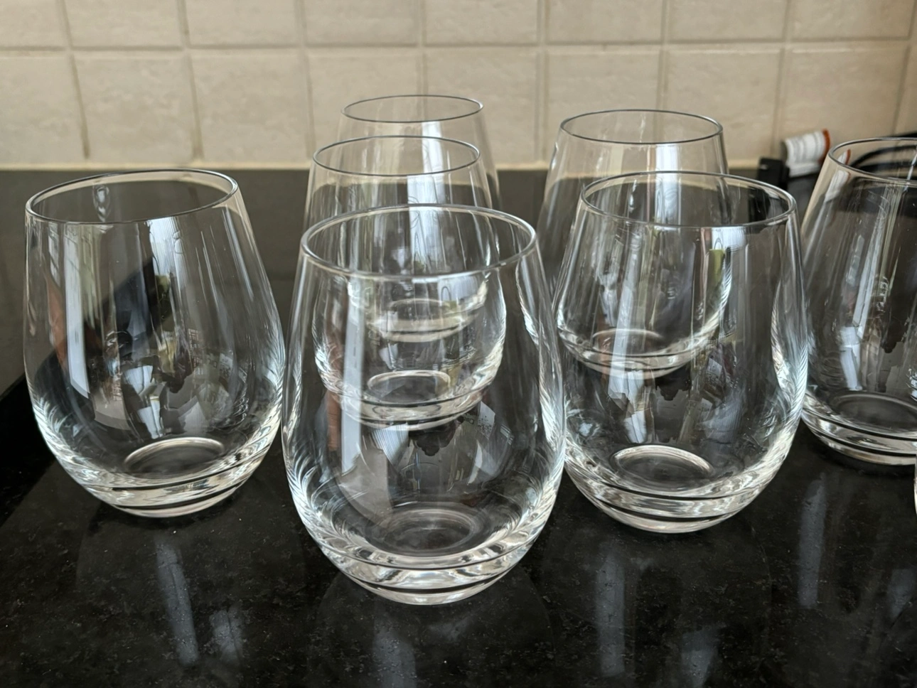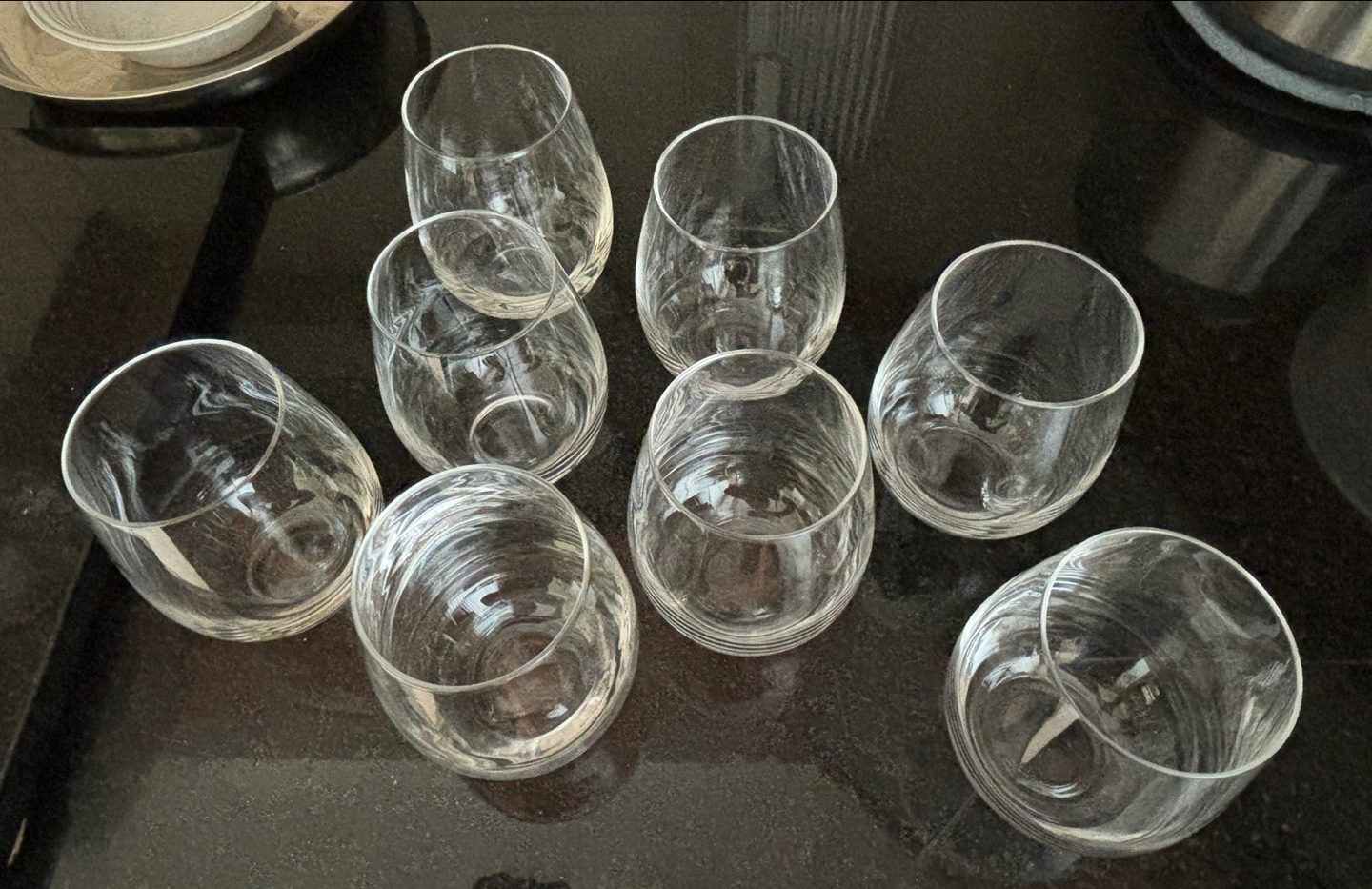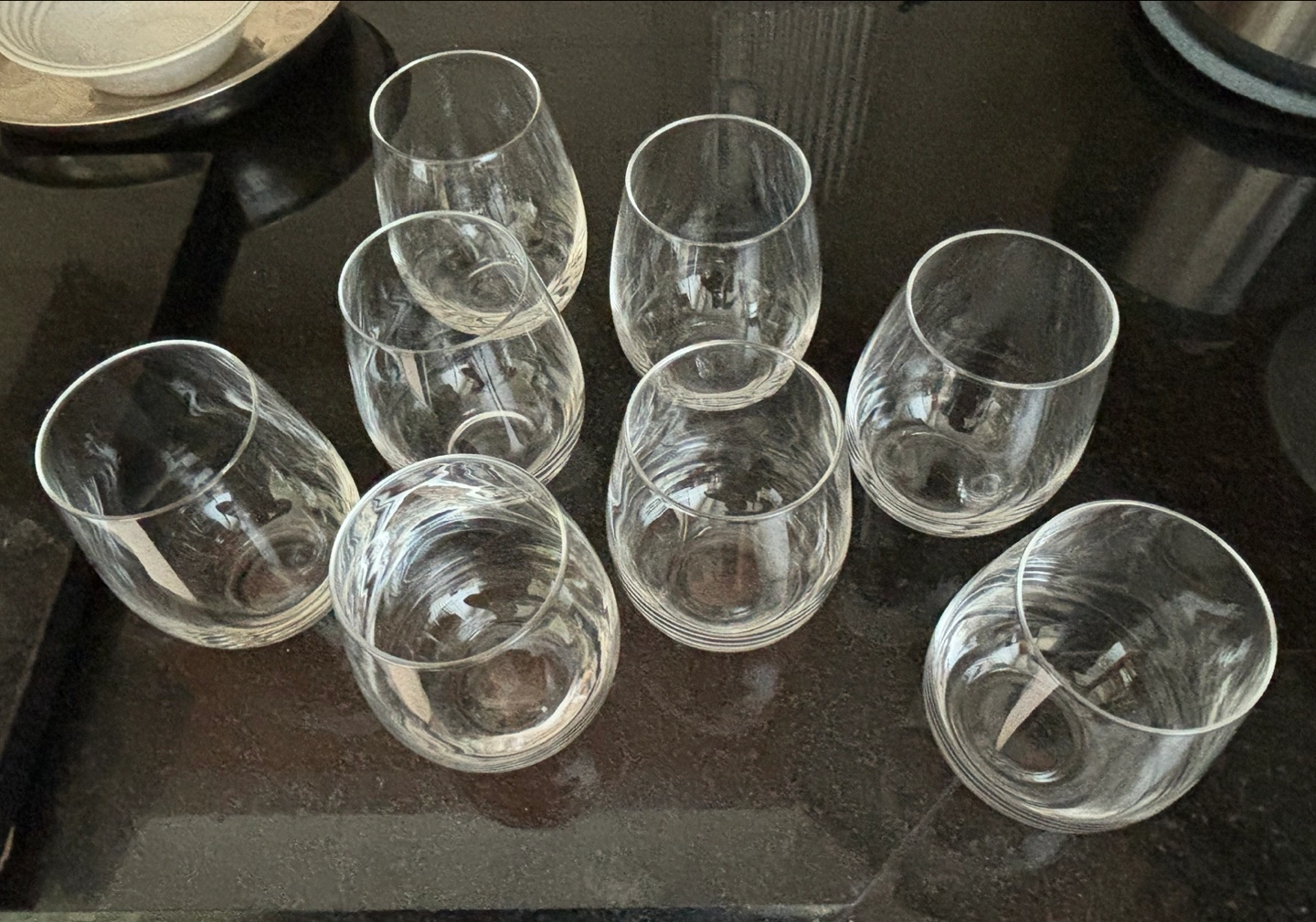 Set of 8 stemless wine glasses in pristine condition. Use for wine or as water glasses. No chips or cracks. A great addition to your table setting! Measurements Holds 9 oz 5 inches tall