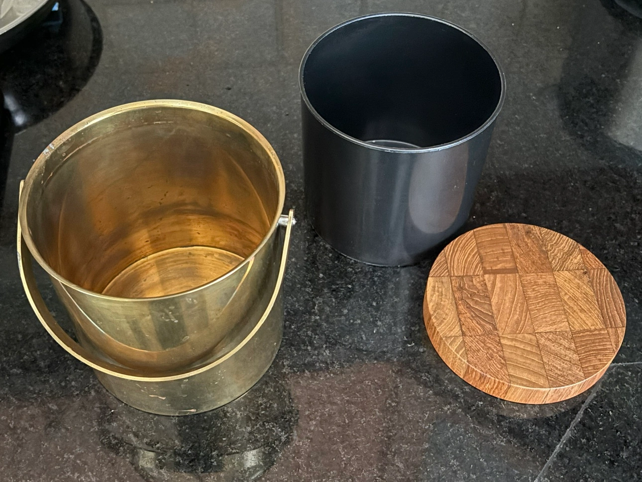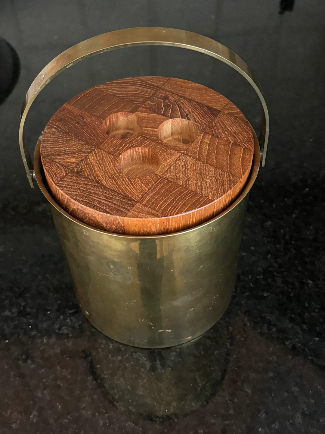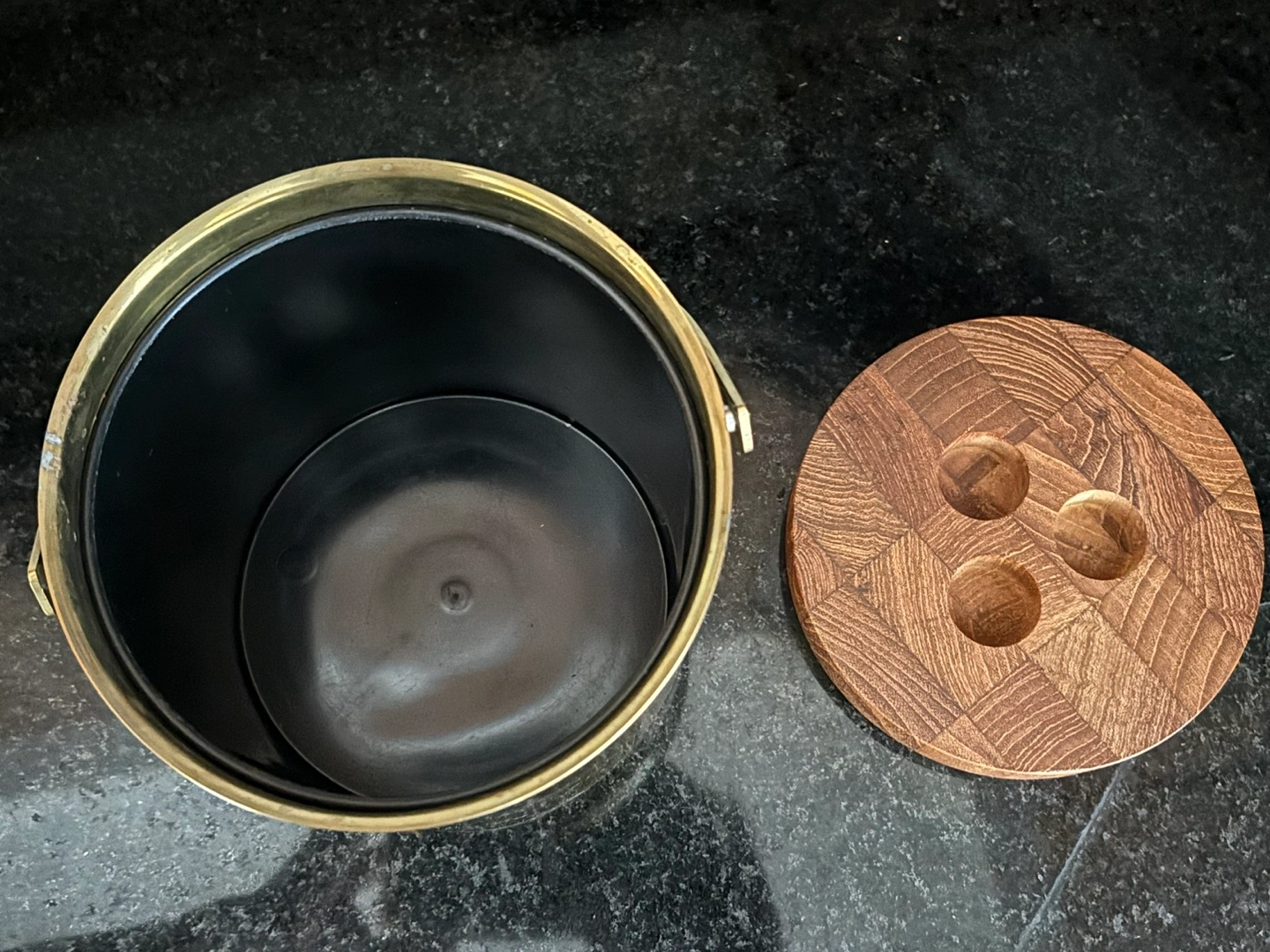 A brass ice bucket with handle and a wooden lid Bucket lined with a plastic, removable bucket (5 inches in diameter / 4.5 inches in depth) for easy cleaning. Bucket needs polishing and will sparkle like new! A great addition to your bar cart or beverage bar!