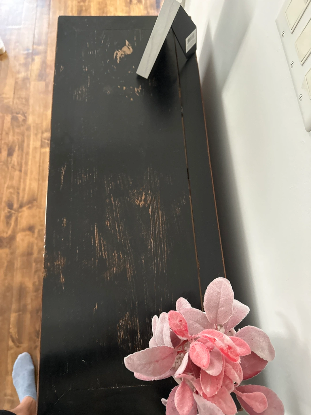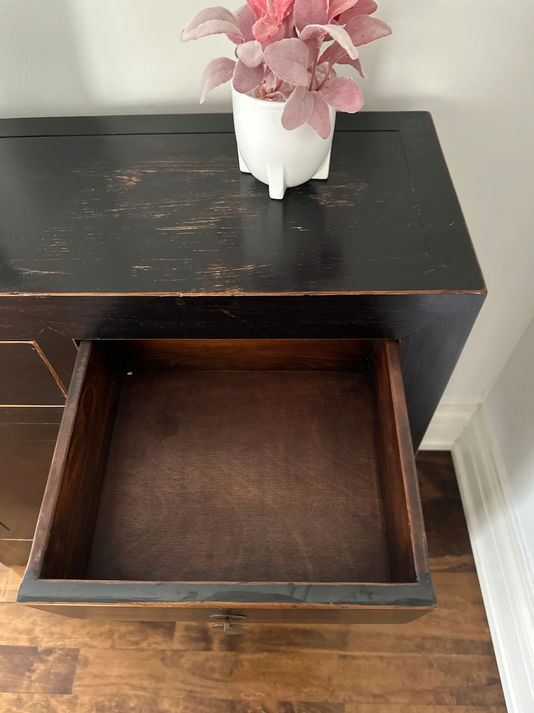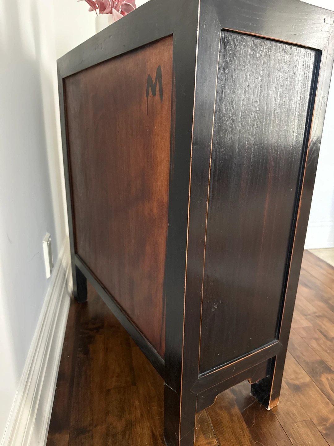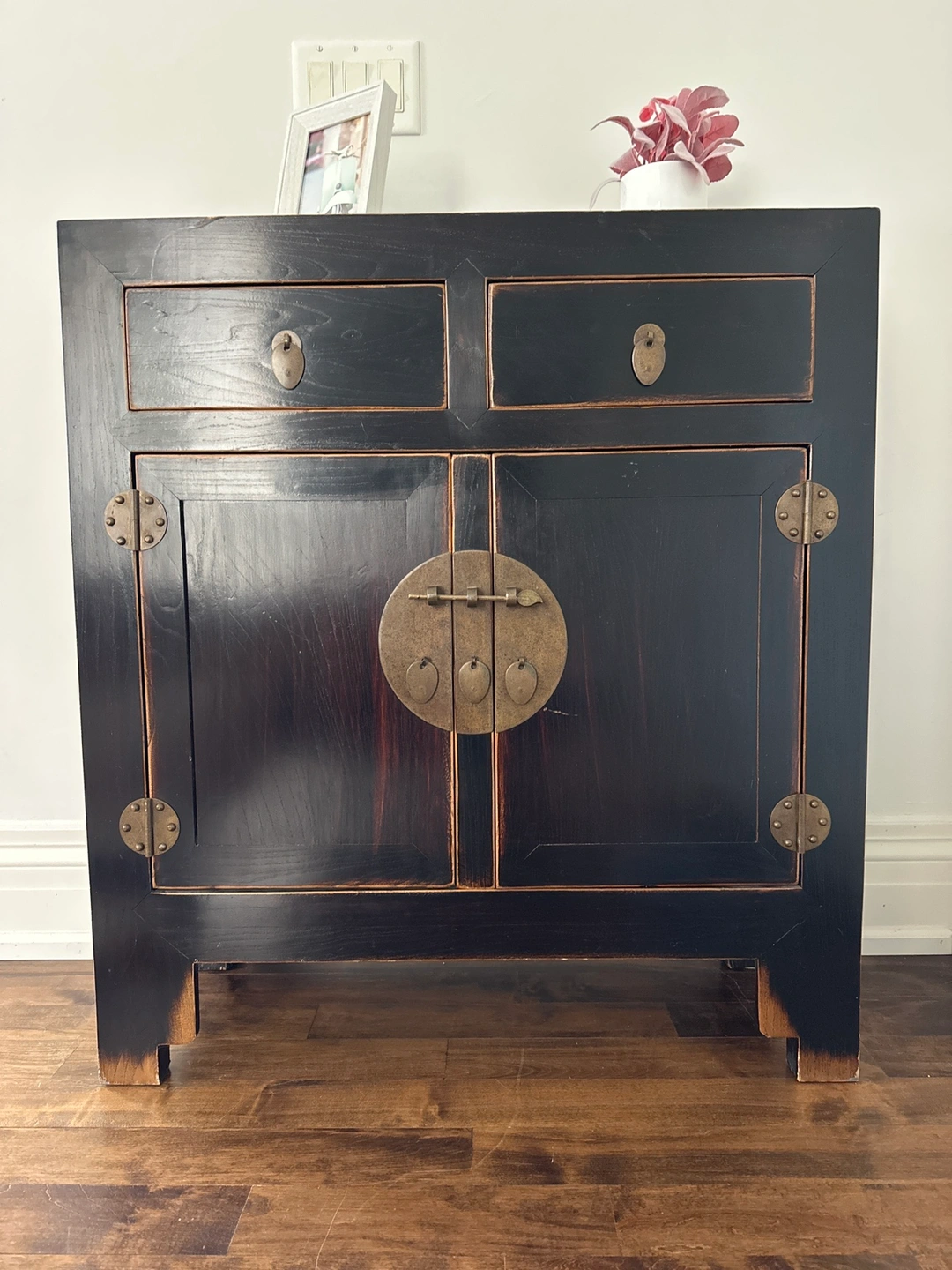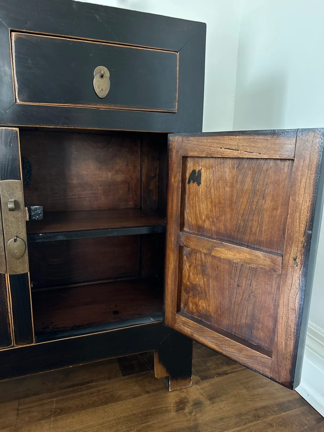 This cabinet features two drawers and two doors with a shelf inside. It is made from wood and has a black finish. It stands on four legs. IT’s antique Chinese cabinet