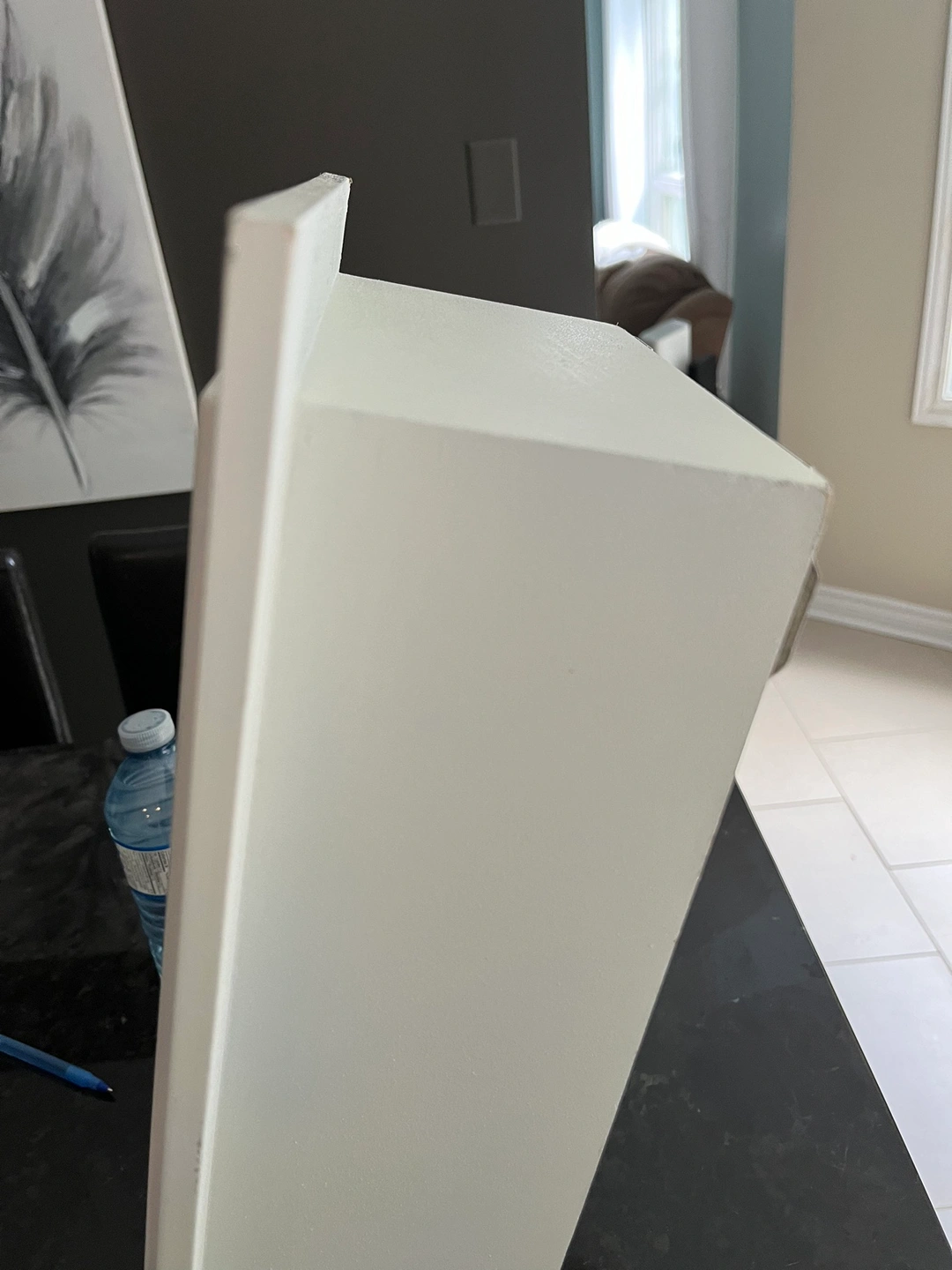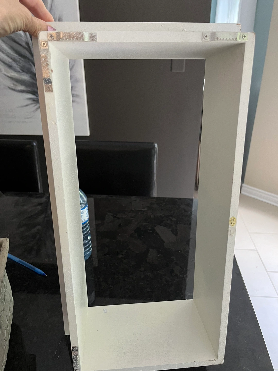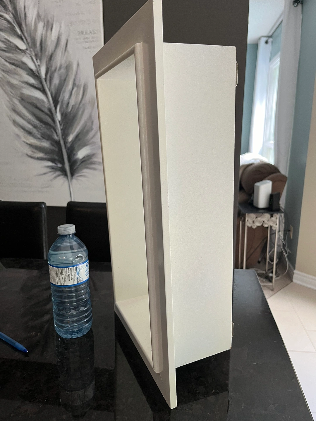 White floating shelf, approximately 18 inches tall, 10 inches wide and 4.5 inches deep. Can be hung in either direction. Only 2 nails needed. Flaw on one corner but can easily be touched up with white paint . Price reflects this Serious buyers only please. Porch pick up at McCowan and 16th in Markham.