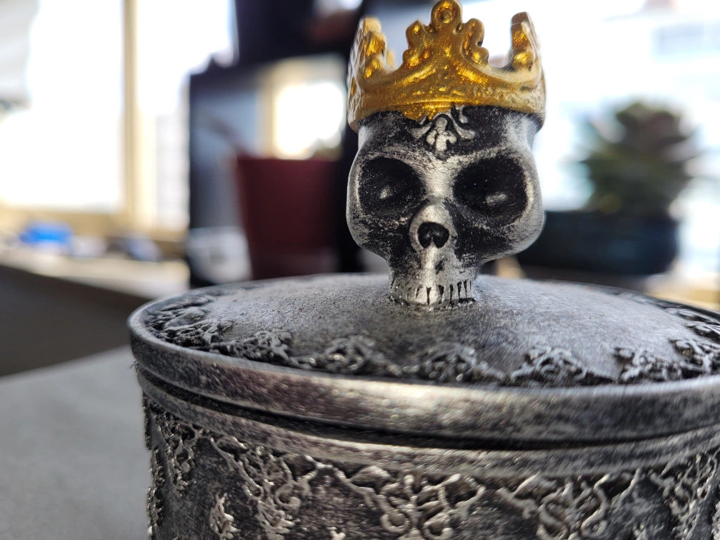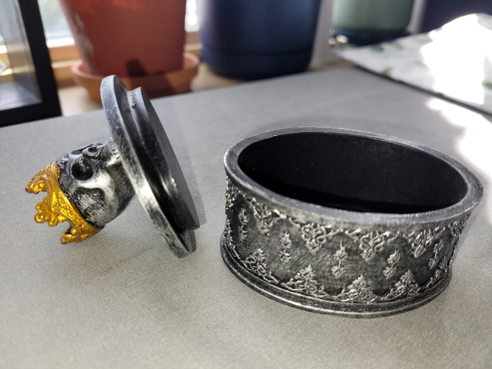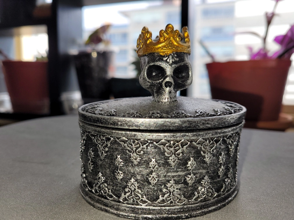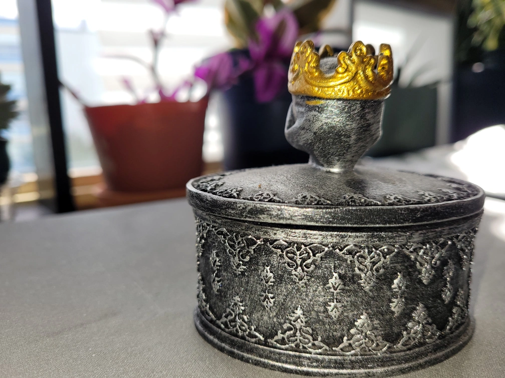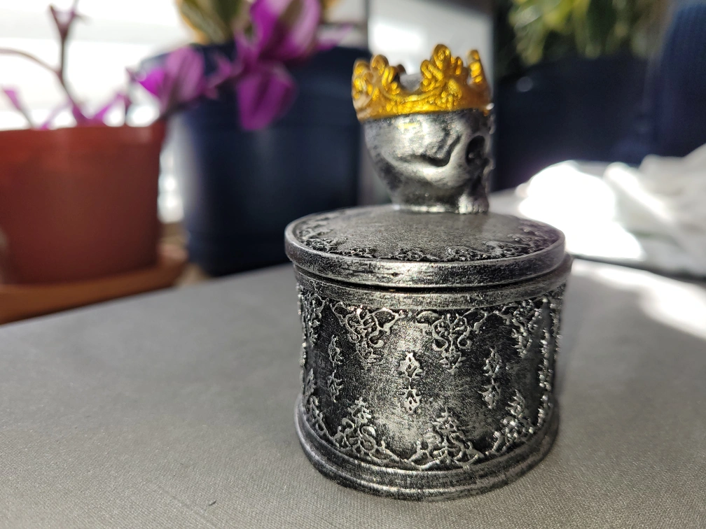 A silver trinket box with a skull wearing a gold crown on the lid. The box has a floral pattern around its sides. Resin box.