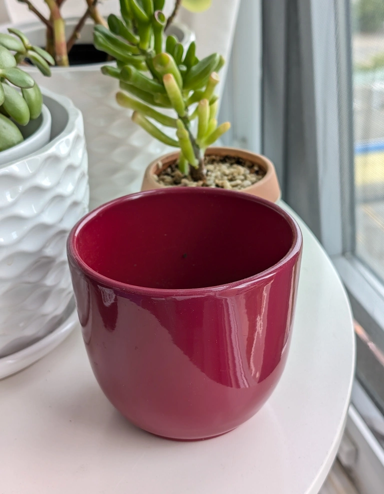 This is a red ceramic plant pot. It is approximately 4 inches tall and 4 inches wide. It is in good condition. It is perfect for small plants.πΏ Pick up at Leslie/Sheppard near North York IKEA. From smoke-free pet-free home. Please see other listings.
