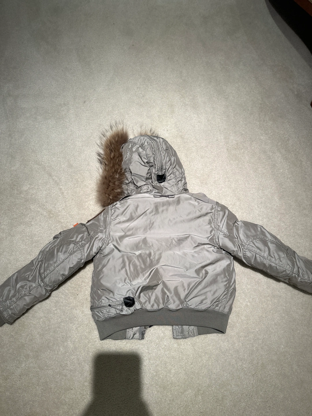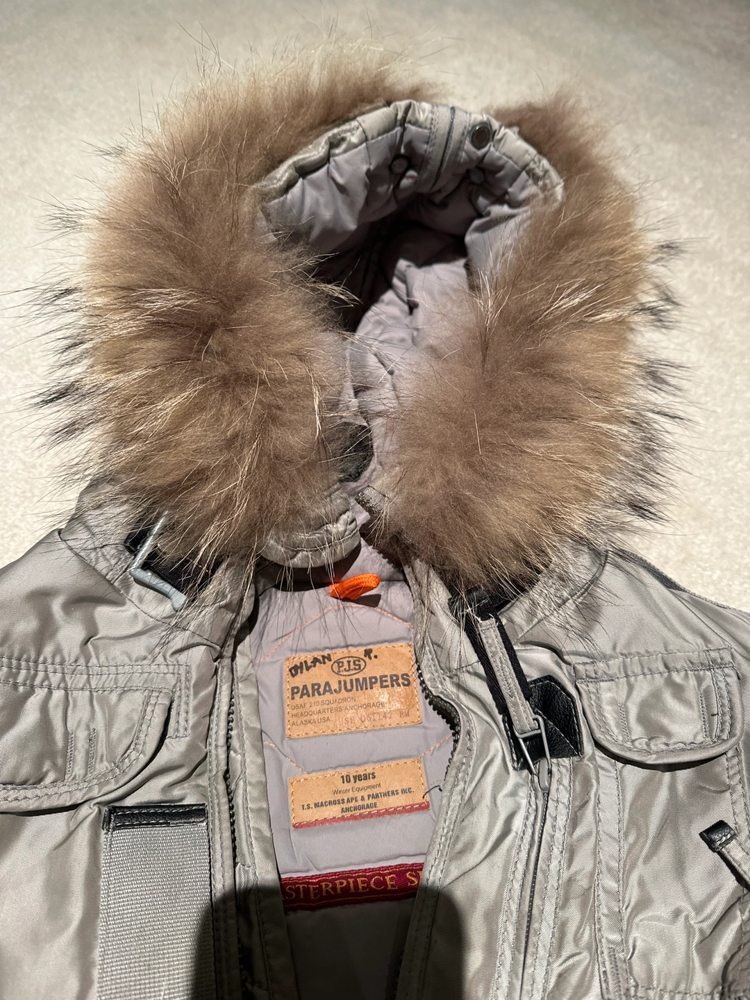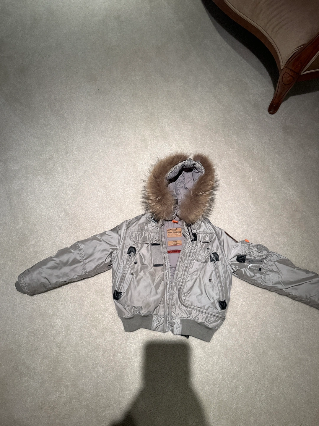 Grey bomber jacket with fur hood. The jacket has the brand's signature orange and black patch on the arm. The jacket is in size 10 years by Para Jumpers. Bought from Sporting life