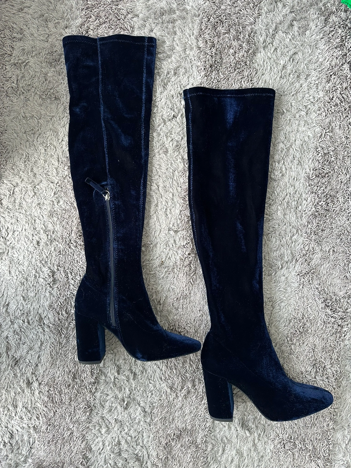 Blue velvet knee-high boots with a block heel and side zipper. Brand new, never worn. In perfect condition. Pick up from Liberty Village