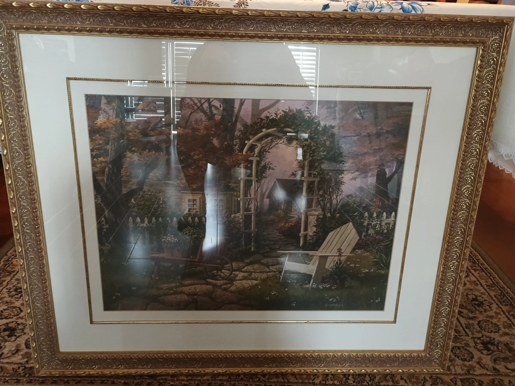 A framed print of a garden with a cottage The print is in a gold-toned frame with a white background