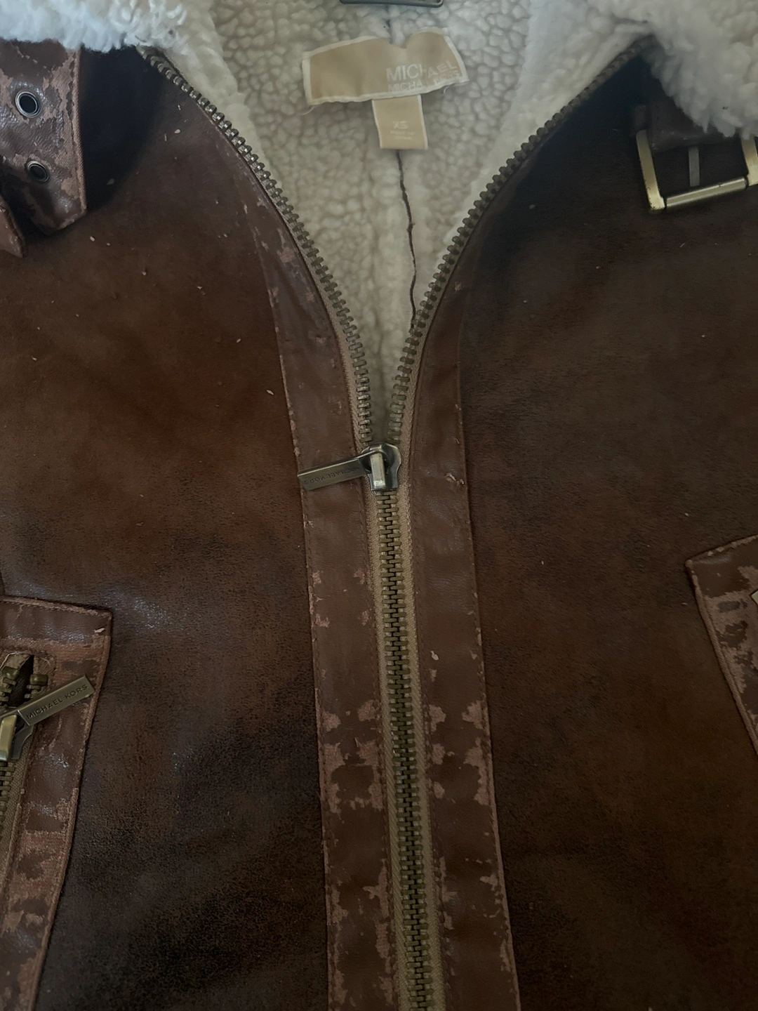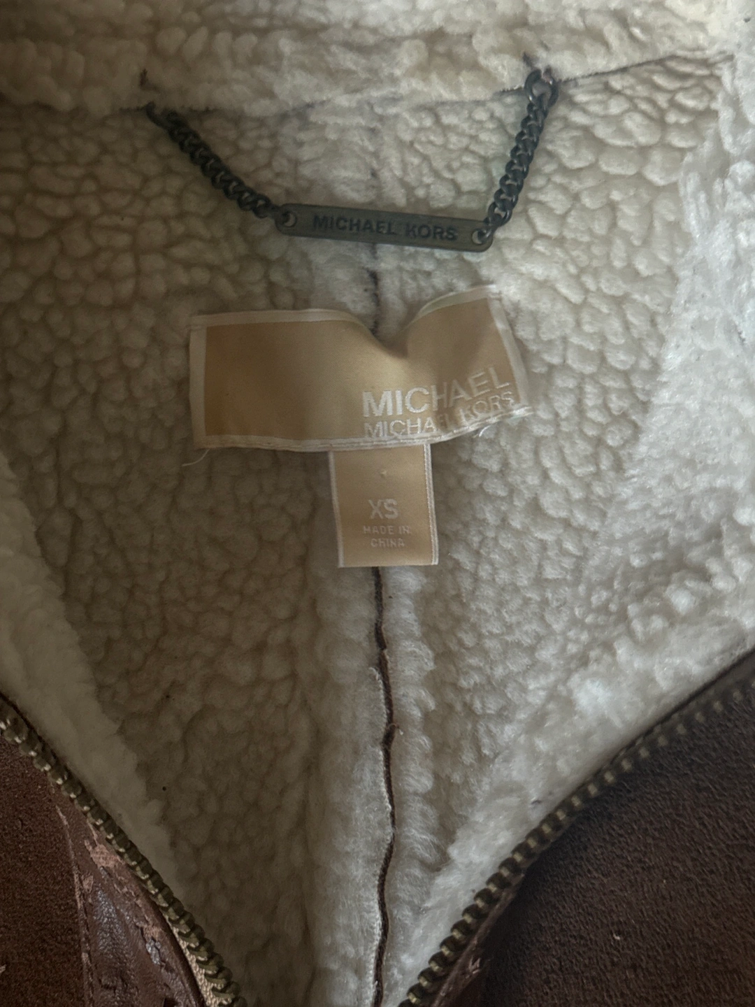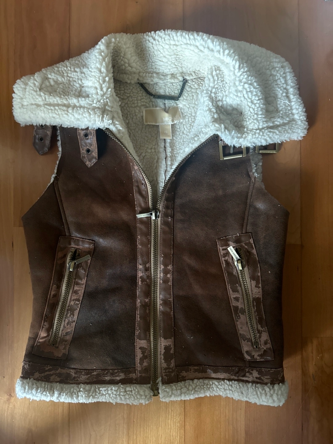 Size XS to S. More like S. Super warm, faux suede , brown colour, white sherpa lining. Pu is falling off so keep that in mind. Need to remove the PU part.