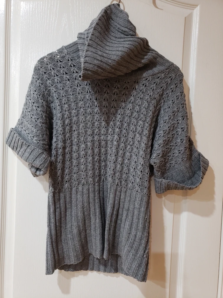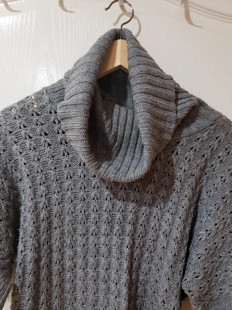 A grey knit sweater with a turtleneck and three-quarter sleeves. It is a loose fit and made of a soft, comfortable material.