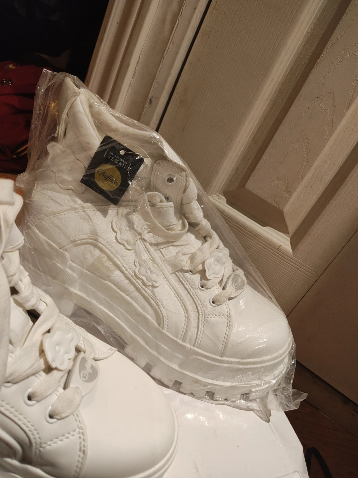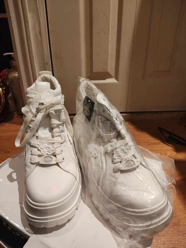 These are a pair of white platform sneakers. They have a chunky sole and lace-up closure.