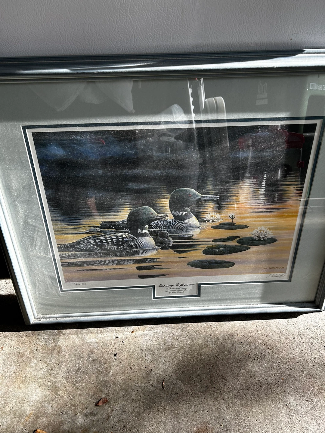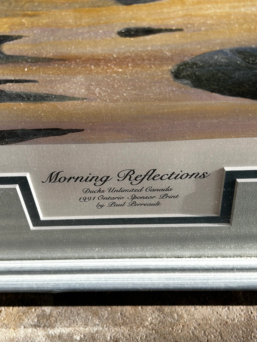 Framed print of a painting by Paul Perrault entitled "Morning Reflections". Ducks Unlimited Canada 1991 Ontario Sponsor Print. Good condition pick up area Bayview and Sheppard.