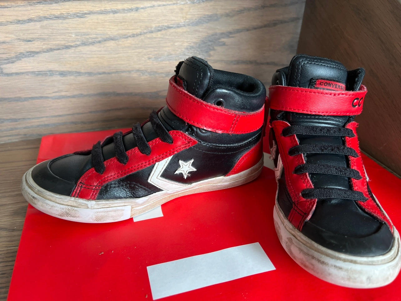 Black and Red Leather High Top Converse Sneakers with Velcro Strap. They are in good condition. They are a size 1. They have some minor wear and tear.