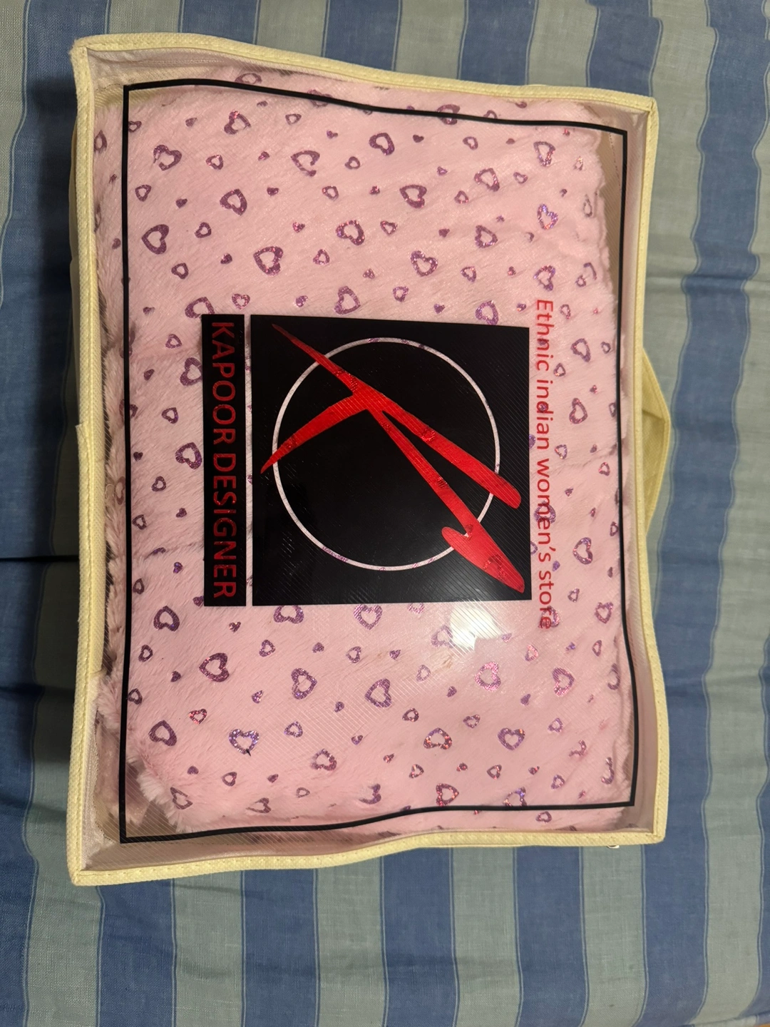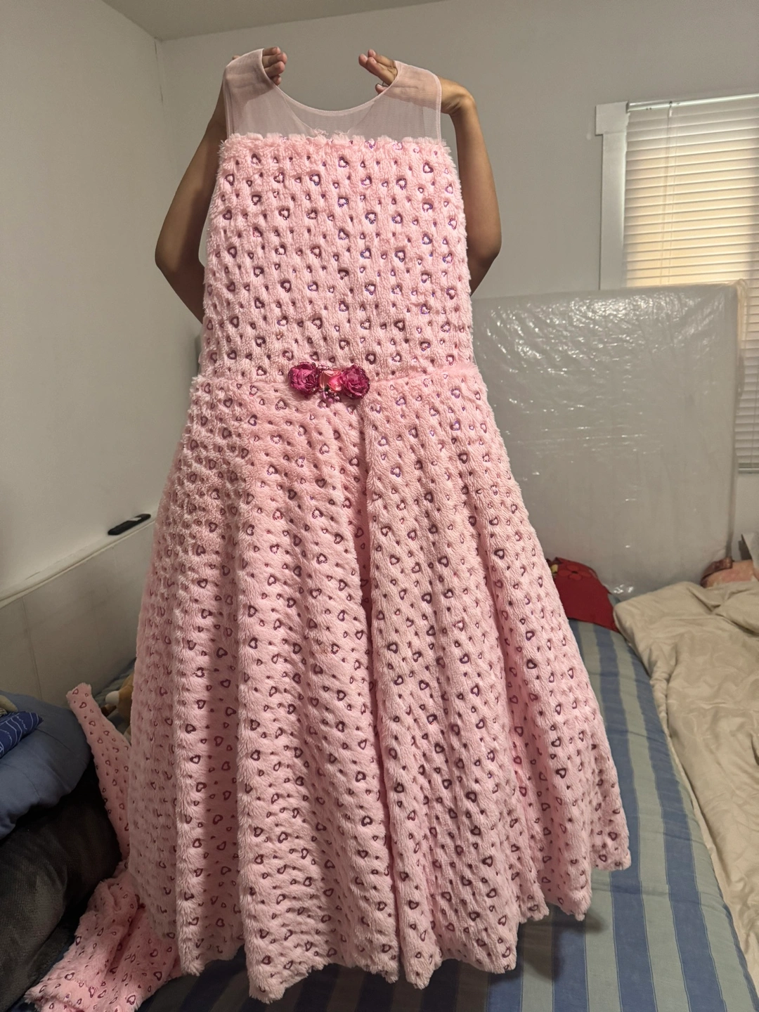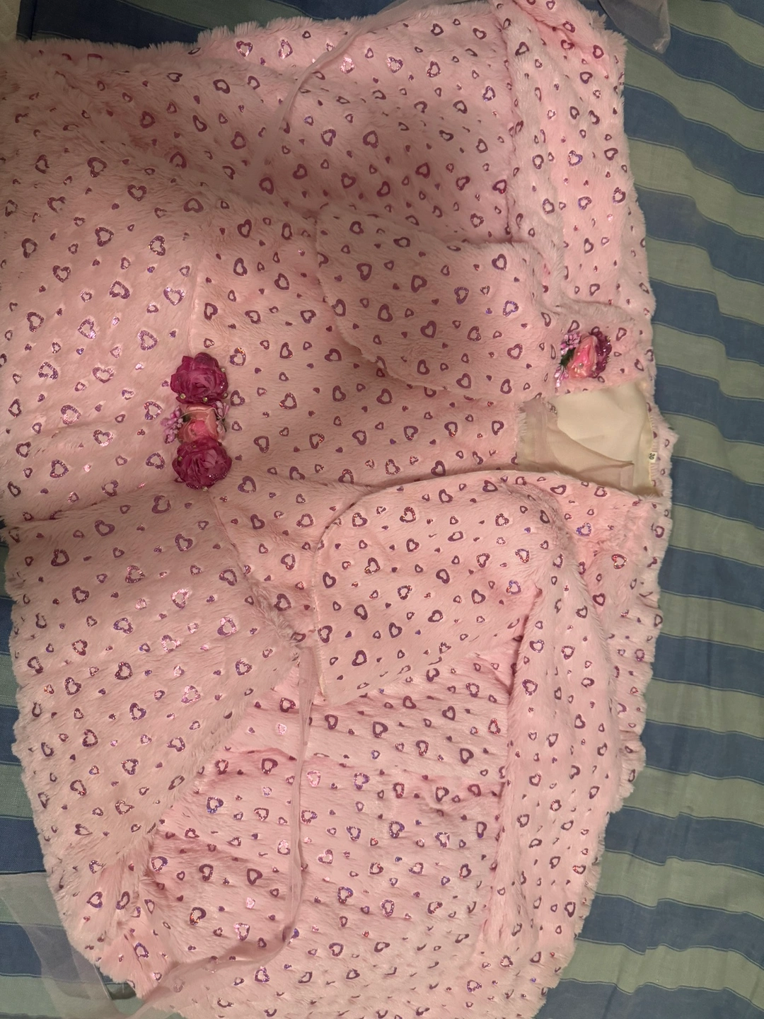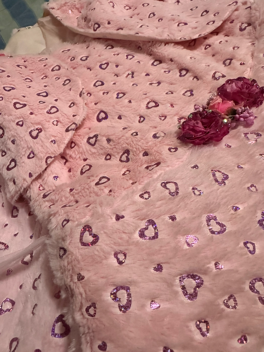 This is a pink jacket with a faux fur exterior. It is covered in small pink sequins that are in the shape of hearts. The jacket has a few embellishments and comes in its original packaging. My daughter only wore once for her 9th Birthday 🥳