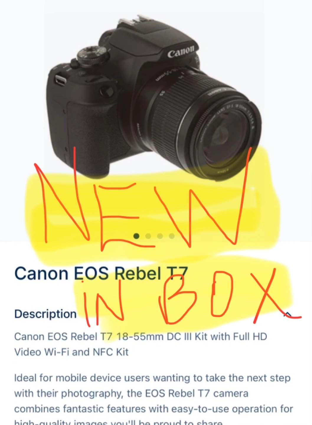 Canon EOS Rebel T7 DSLR Camera with 18-55mm interchangeable lens. Please, I won’t answer anonymous low ballers. Price is firm. Sorry, Tired of waisting time on low ballers Please Bundle other items I’m selling for a discount. Will deliver nearby at full asking price Brand New in box, only opened for photos. Just not what we need. Will charge battery for serious buyers only. See photos for more description and retail price plus tax. I’m Happy to answer questions as l sales final.