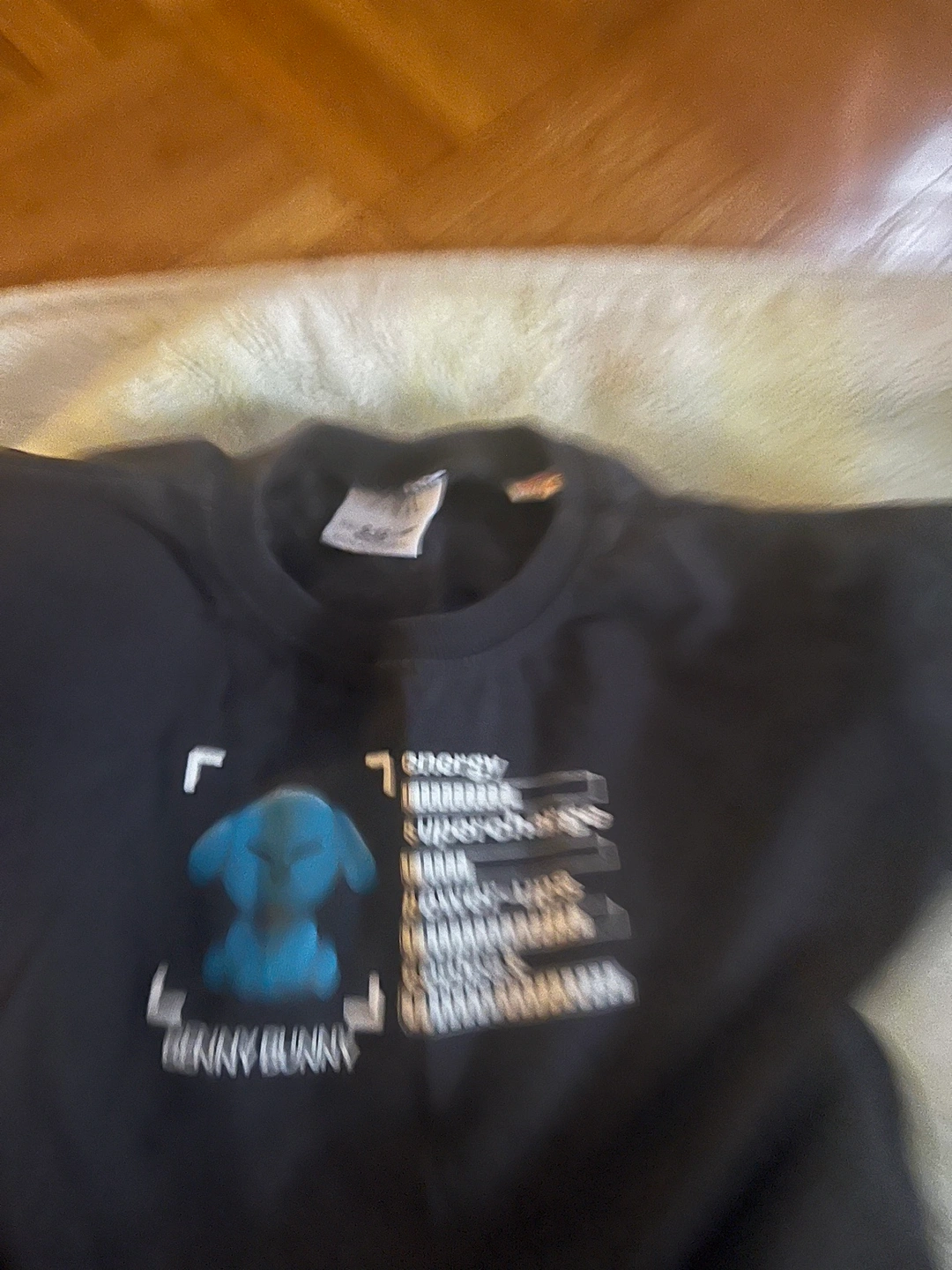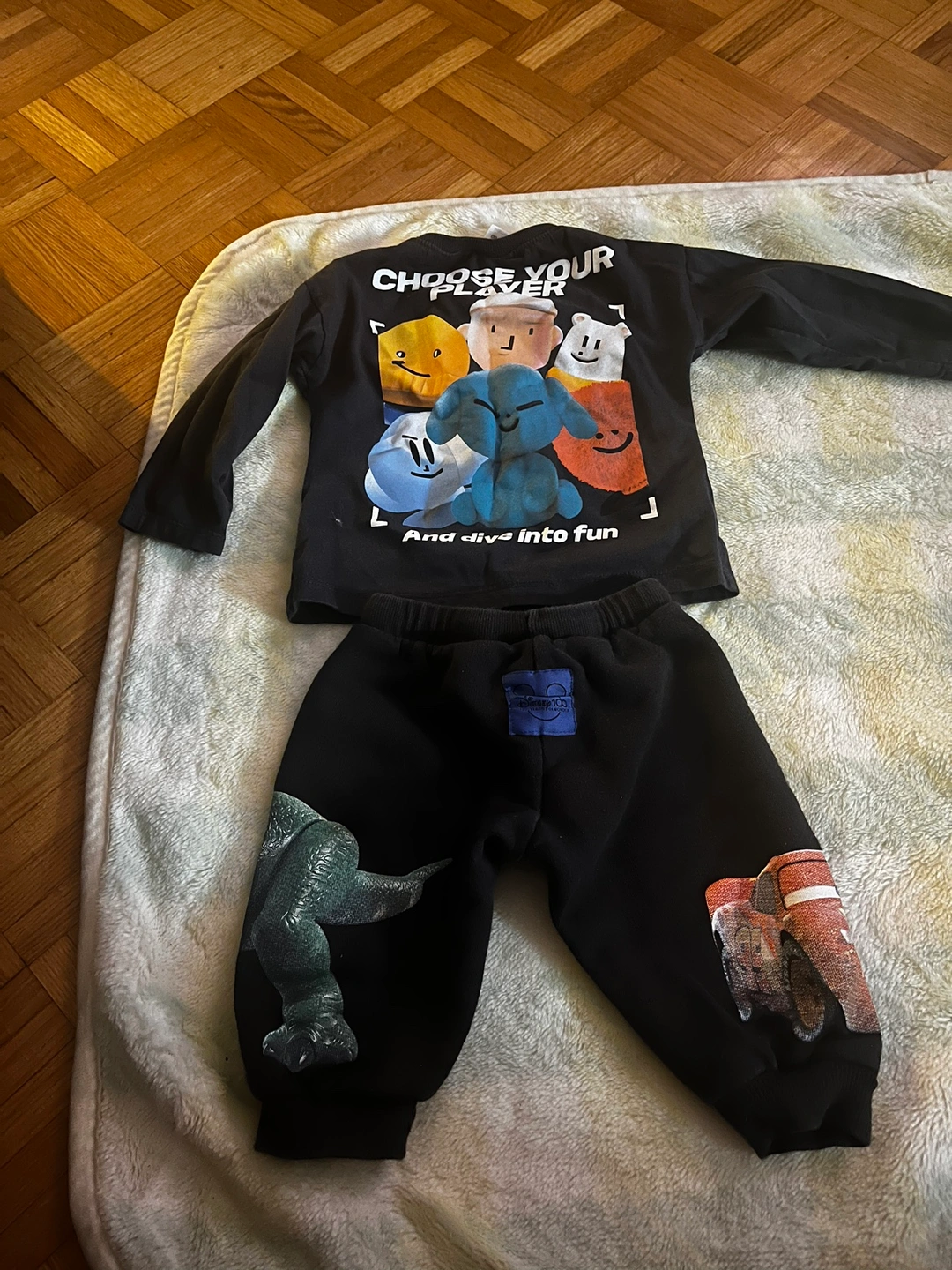 Black long-sleeved shirt and black pants with various cartoon characters. 9-12 months.