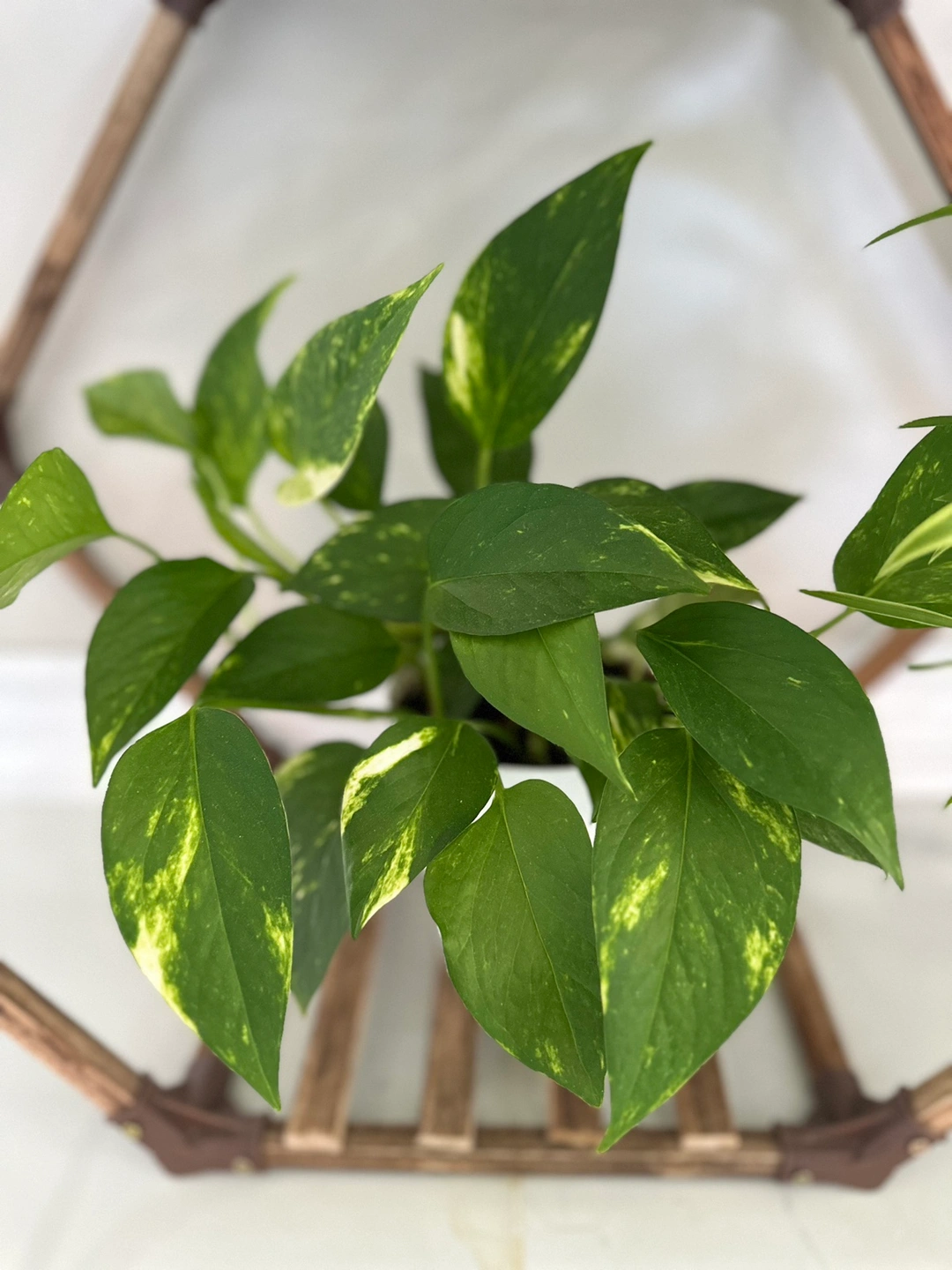 A small potted golden pothos plant with vibrant green and yellow leaves. Easy care. Available in a pot and available small clipping in glass.