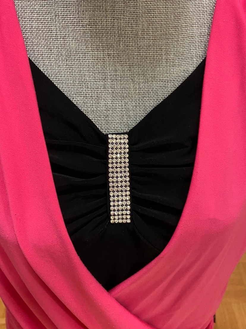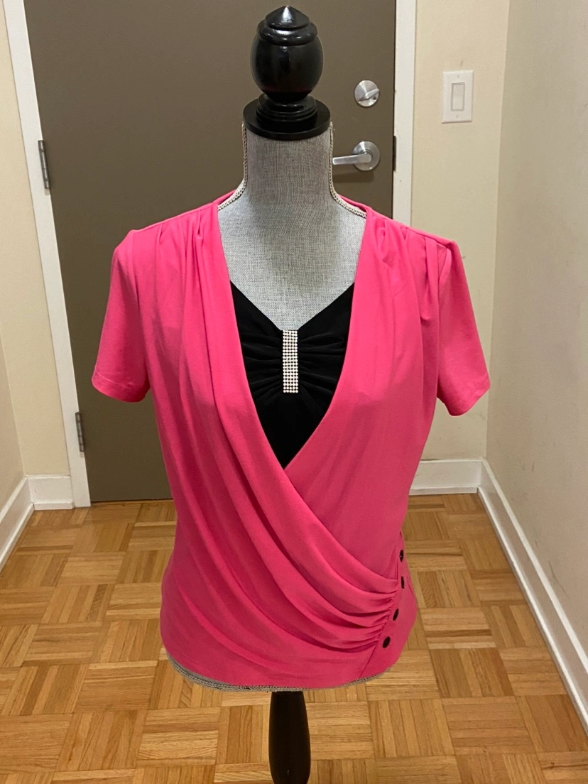 This is a pink and black blouse with a sparkly detail on the front. It is a size Small.