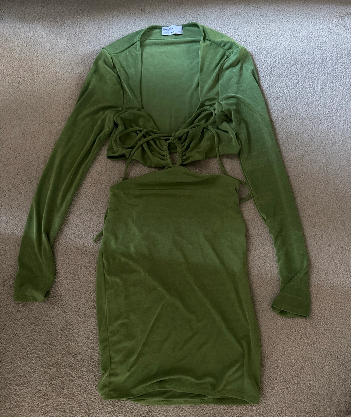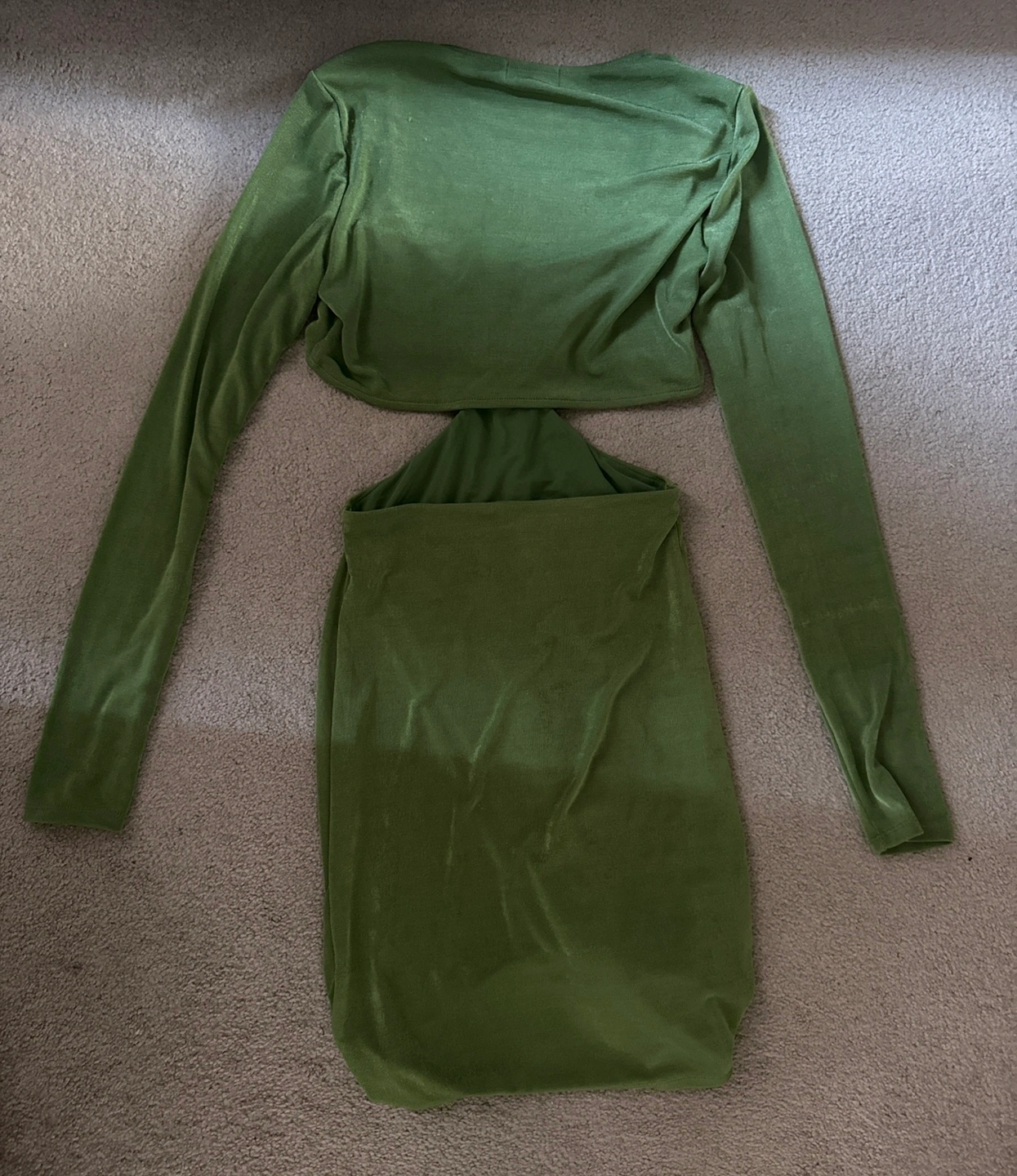 This is a green long sleeve dress with a cutout in the torso. The dress is fitted. Says L but closer to M.