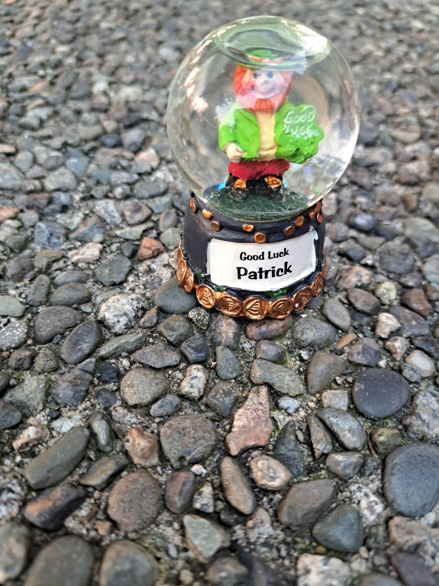 A snow globe with a leprechaun inside. It reads "Good Luck Patrick" on the bottom.