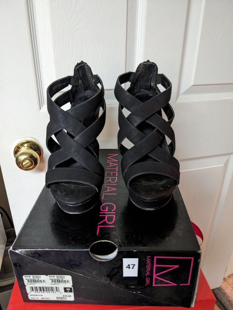 Black Material Girl wedge sandals, size 8 They feature a zipper on the back.