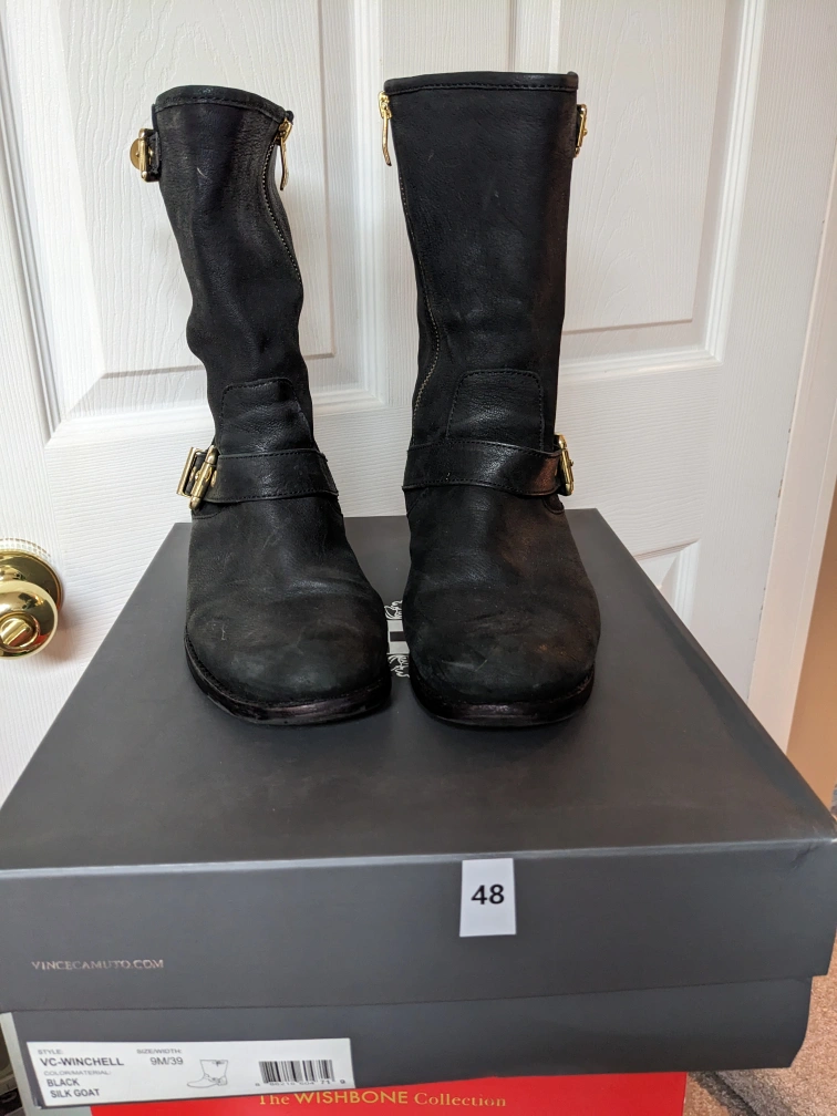 These are black leather motorcycle boots with a gold buckle. They are in size 9, They are in the original box.