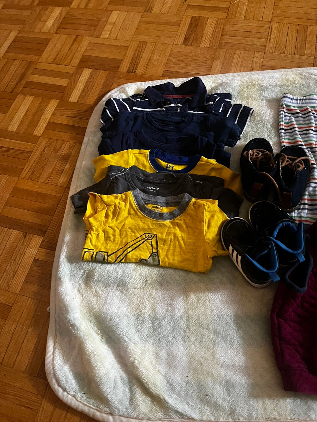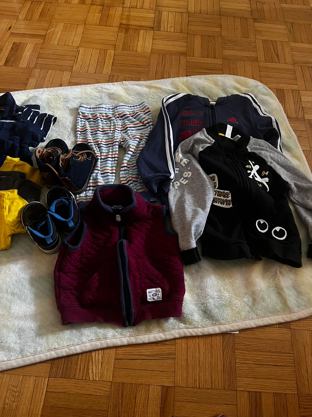 A bundle of clothing 6-12 and sweater for a young boy, including tops, bottoms, and shoes.